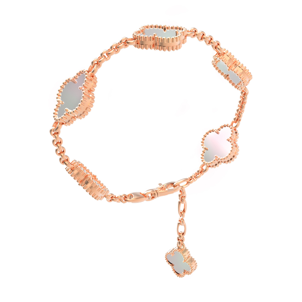 Вставки из перламутра с их мягким, переливчатым сиянием гармонично сочетаются с теплым оттенком красного золота, создавая изысканный и сдержанный контраст. Каждый элемент браслета тщательно проработан, чтобы подчеркнуть красоту натуральной вставки и блеск металла. Этот аксессуар отличается универсальностью: он подойдет как женщинам, так и мужчинам, предпочитающим стильные и лаконичные ювелирные изделия.