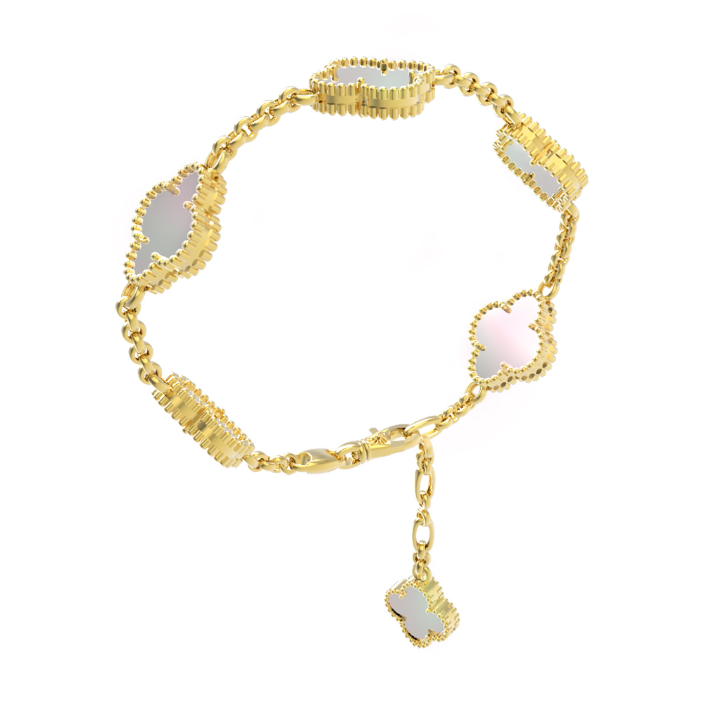 Это украшение универсально: браслет одинаково гармонично смотрится как на женском, так и на мужском запястье, подчеркивая вкус своего владельца. Фирменный дизайн клевер, воплощенный в драгоценном металле, делает изделие подходящим для повседневного ношения или особого случая. Качественная обработка металла и надежная фиксация перламутра обеспечивают долговечность и комфорт при использовании.