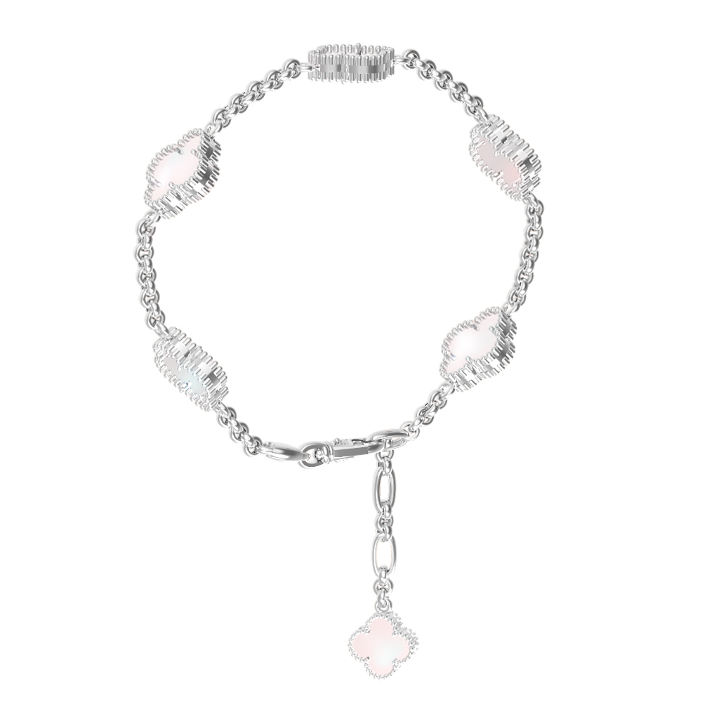 Изысканный браслет из белого золота 585 пробы из коллекции De Luxe — Клевер станет воплощением утонченного стиля и грации. Этот ювелирный аксессуар объединяет в себе благородный блеск металла и нежное сияние перламутра, создавая гармоничный образ для любого случая. Дизайн изделия выполнен в форме четырехлистного клевера — символа удачи, который придает украшению особую эстетическую привлекательность.