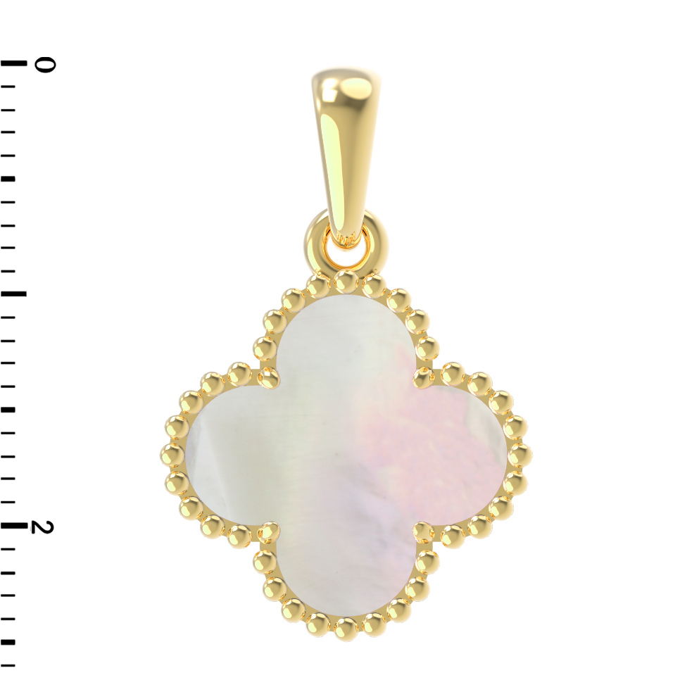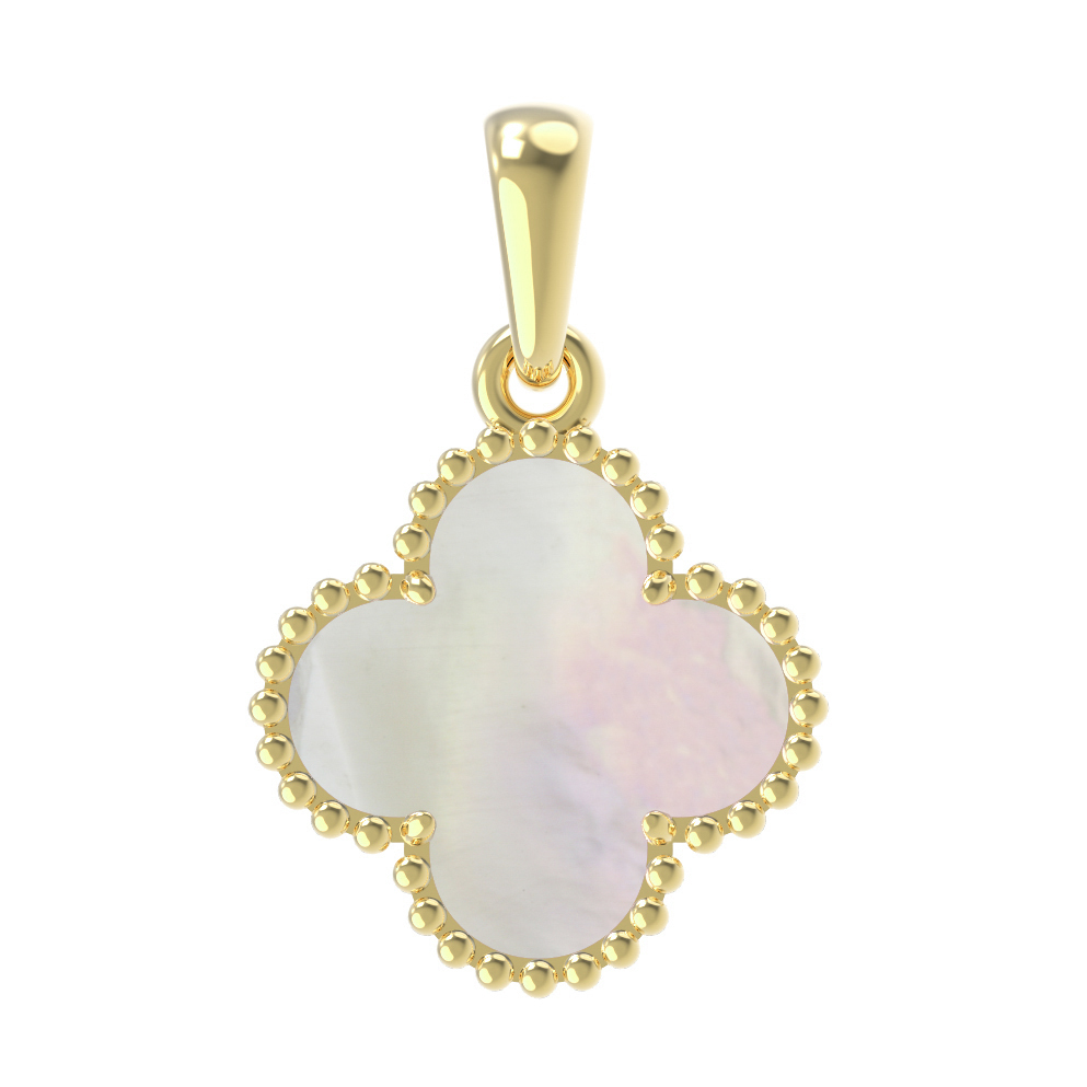 Центральным элементом композиции является вставка из натурального перламутра. Перламутр обладает уникальным цветом и природным блеском, который меняется в зависимости от освещения, создавая неповторимые переливы. Дизайн в виде клевера подчеркнут аккуратной окантовкой из золотых бусин, что добавляет изделию фактурности и глубины. Такая деталь делает украшение узнаваемым и стильным акцентом в повседневном или вечернем гардеробе.