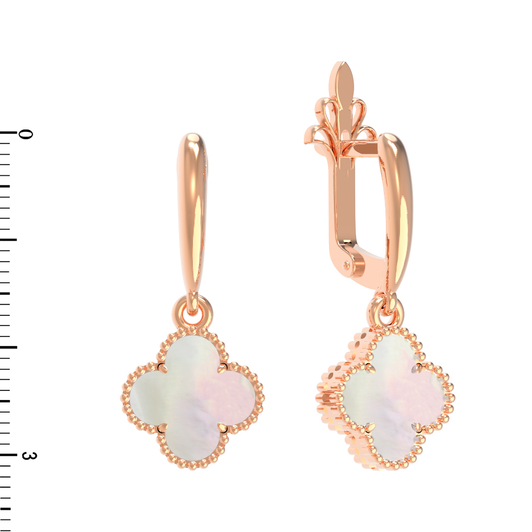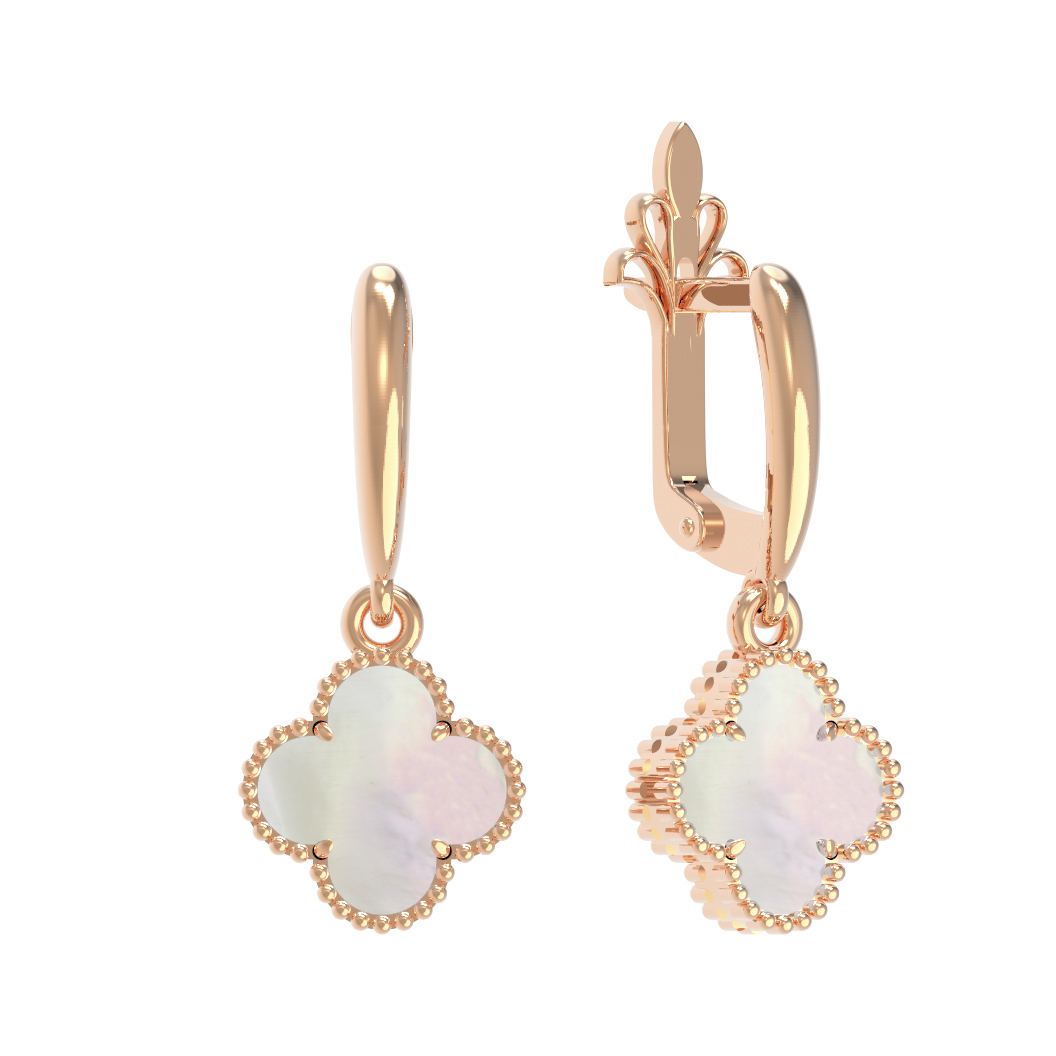 Дизайн в форме клевера — это символ удачи и гармонии, который никогда не выходит из моды. Благодаря лаконичному и продуманному оформлению, серьги гармонично смотрятся как в повседневных деловых сетах, так и в вечерних нарядах. Красное золото теплого оттенка подчеркивает сияние перламутра, создавая благородный контраст, который привлекает внимание к вашей внешности.