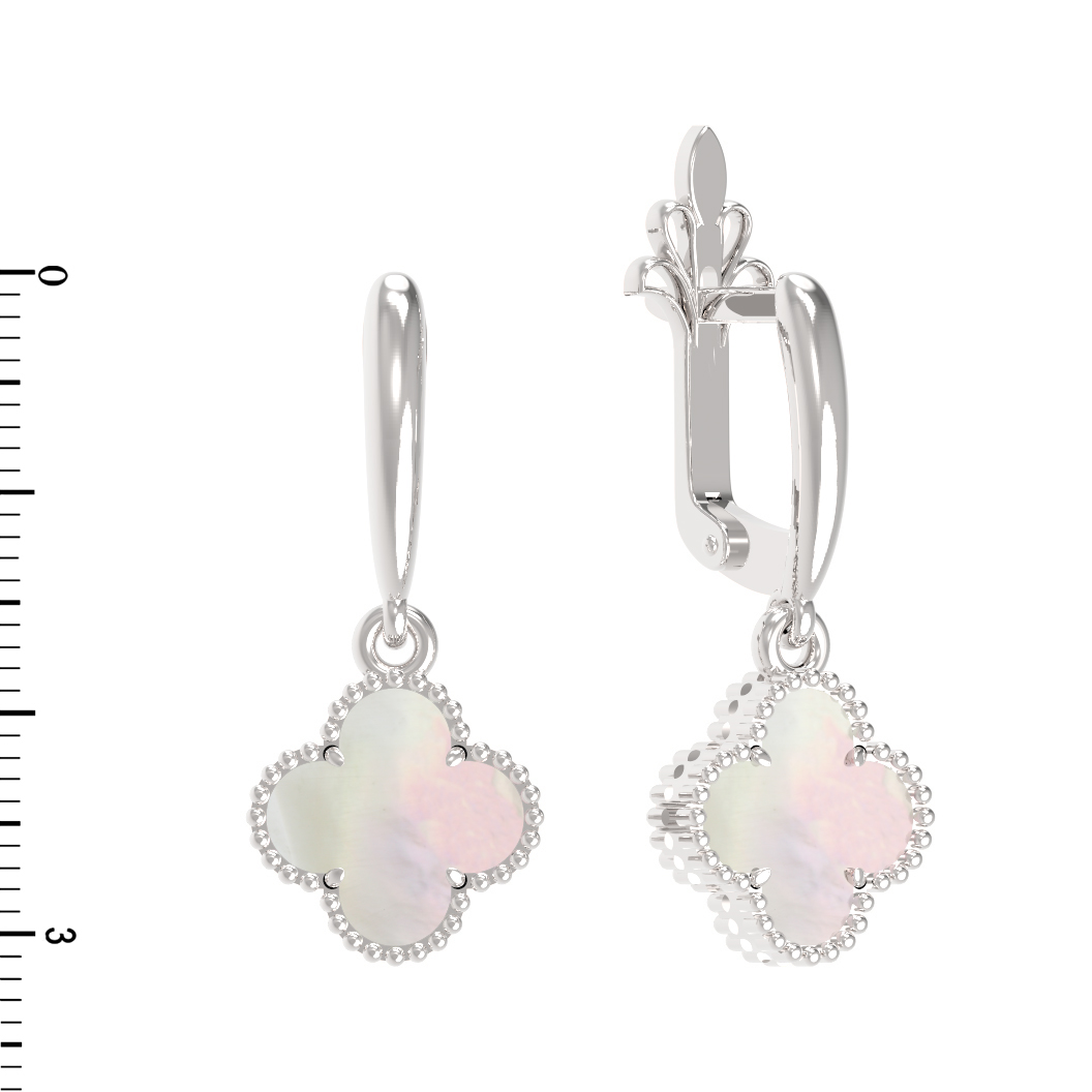 Серьги отличаются продуманной композицией, где центральным элементом выступает вставка из перламутра. Натуральный минерал переливается перламутровыми оттенками, придавая изделию особую глубину. Дизайн в виде четырехлистного клевера считается классическим символом, который уместен в любом гардеробе, будь то деловой костюм или вечернее платье.