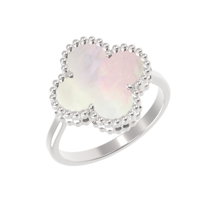 Изысканное кольцо из белого золота 585 пробы станет утонченным акцентом вашего образа. Данная модель выполнена в узнаваемом и гармоничном дизайне в форме клевера, что придает украшению особую эстетику. Центральным элементом композиции является вставка из перламутра с нежным переливом, которая эффектно контрастирует с холодным блеском благородного металла. Белый цвет золота и натуральный перламутр создают элегантное сочетание, которое подходит как для повседневного ношения, так и для торжественных выходов.