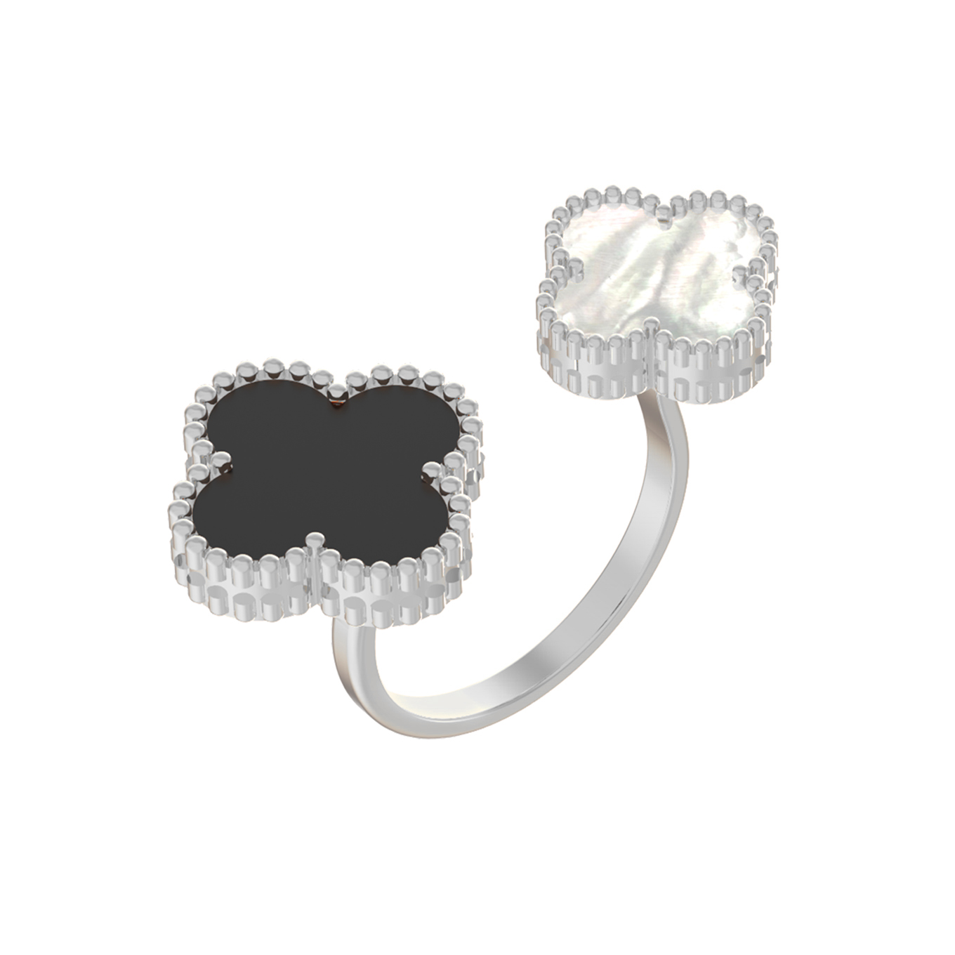 Элегантное кольцо из белого золота 585 пробы из коллекции De Luxe — Клевер станет безупречным акцентом вашего образа. Это стильное ювелирное украшение выполнено в изысканном дизайне в форме клевера, что придает изделию особую притягательность и символичность. Контрастное сочетание материалов подчеркивает благородство металла: кольцо украшено двумя вставками, одна из которых выполнена из глубокого черного оникса, а вторая — из нежного перламутра.