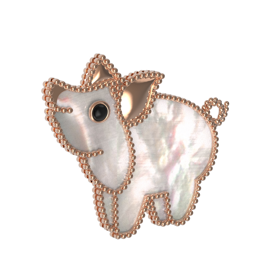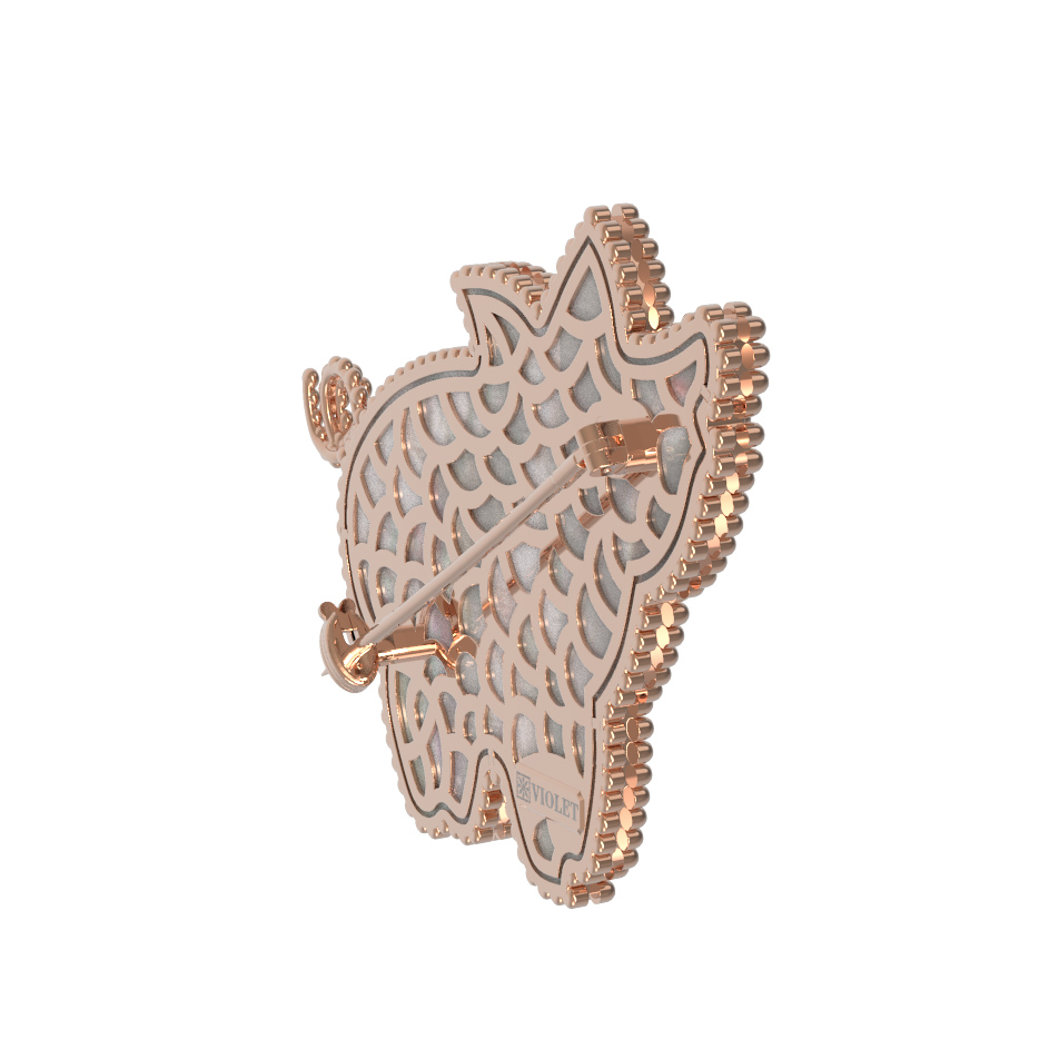 Особую выразительность броши придает сочетание материалов. Основная часть композиции выполнена из натурального перламутра с нежным переливчатым блеском, который гармонично дополняет сияние красного золота. Контуры фигуры деликатно подчеркнуты разноцветной эмалью, что добавляет аксессуару глубины и художественной выразительности. Безупречное сочетание золотого металла и перламутровых вставок делает это украшение по-настоящему уникальным.