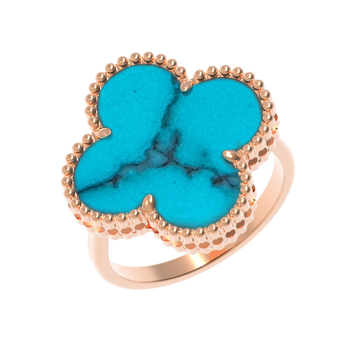 Кольцо из красного золота 585 пробы из коллекции De Luxe — Клевер воплощает в себе гармонию классики и природной красоты. Центральным элементом украшения стал изящный дизайн в форме клевера, который придает изделию особое очарование и символичность. В центре композиции расположена одна крупная вставка из натуральной бирюзы насыщенного бирюзового цвета, чья уникальная фактура эффектно контрастирует с теплым блеском драгоценного металла.