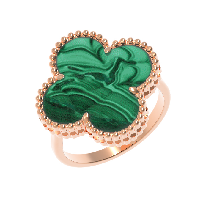 Кольцо из красного золота 585 пробы с малахитом — изысканное украшение, которое станет акцентным дополнением любого образа. Дизайн модели выполнен в форме клевера, символизирующего удачу и гармонию. Сочетание благородного металла и насыщенного зеленого цвета вставки создает глубокий контраст, подчеркивающий статус и утонченный вкус владельца.