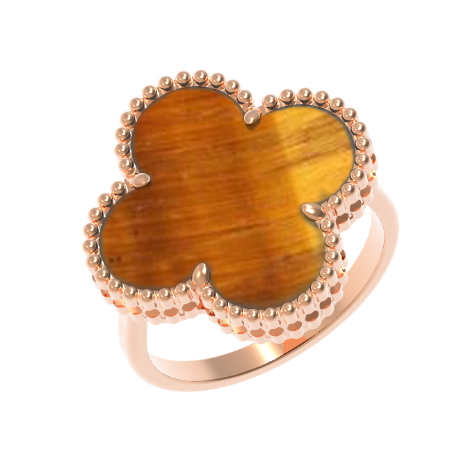 Элегантное кольцо из красного золота 585 пробы станет утонченным дополнением вашего образа, объединяя в себе классическую роскошь и современные дизайнерские решения. Это украшение из коллекции De Luxe — Клевер привлекает внимание своим лаконичным и выразительным исполнением, подчеркивая безупречный вкус владельца. Центральным элементом изделия является вставка из натурального тигрового глаза оранжевого оттенка, ограненная в форме изящного клевера.