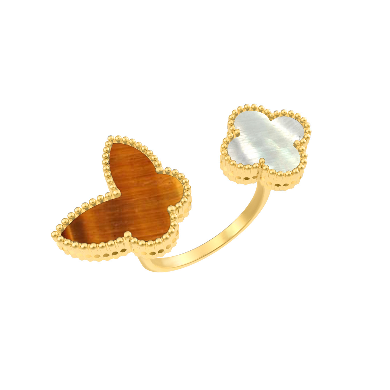 Кольцо из лимонного золота 585 пробы из коллекции De Luxe — Бабочки — это воплощение изящества и оригинального дизайна. Главной деталью украшения стал утонченный мотив бабочки, который подчеркивает легкость и женственность образа. Композиция дополнена контрастным сочетанием материалов: натуральным тигровым глазом оранжевого цвета и нежным, переливающимся перламутром. Мастерство исполнения подчеркивается аккуратной окантовкой каждой вставки, что придает изделию особое очарование.