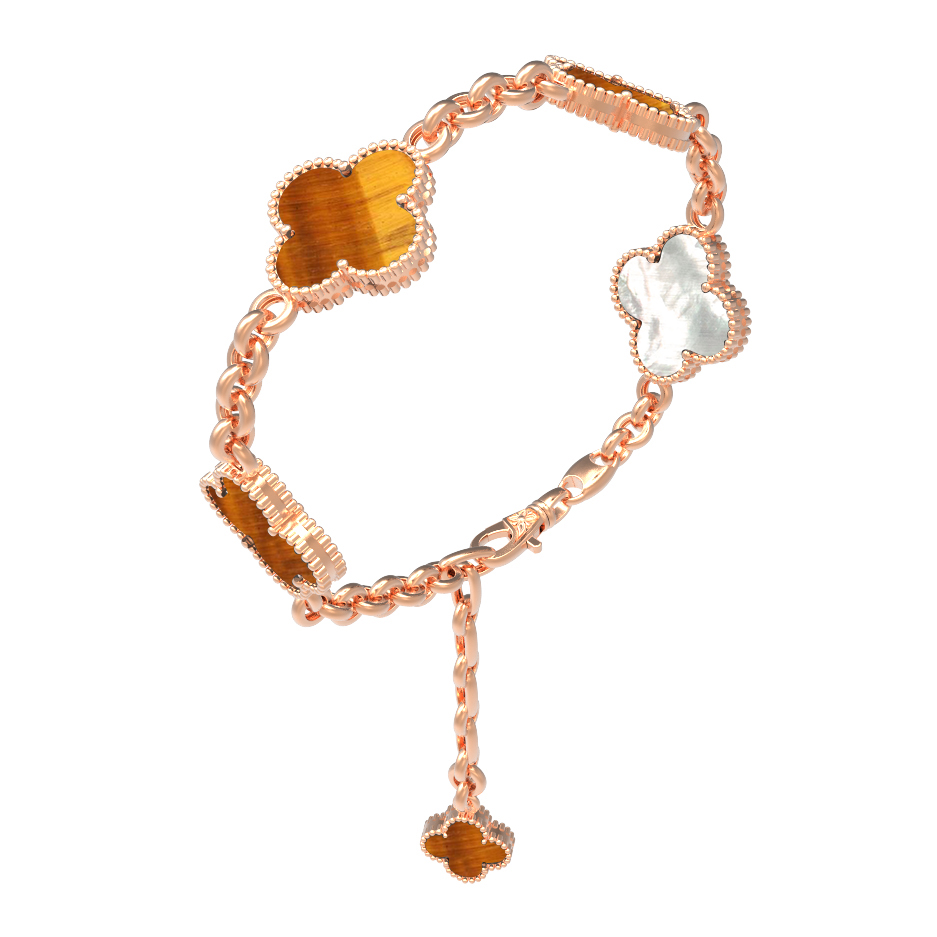 Изящный браслет из красного золота 585 пробы станет утонченным дополнением вашего образа. Украшение входит в коллекцию De Luxe — Клевер, отличающуюся элегантным и узнаваемым дизайном в форме клевера. Ювелирное изделие гармонично объединяет теплоту красного металла с природной красотой натуральных вставок. Центральными элементами композиции выступают пять декоративных вставок: благородный перламутр с нежным переливом и насыщенный оранжевый тигровый глаз.