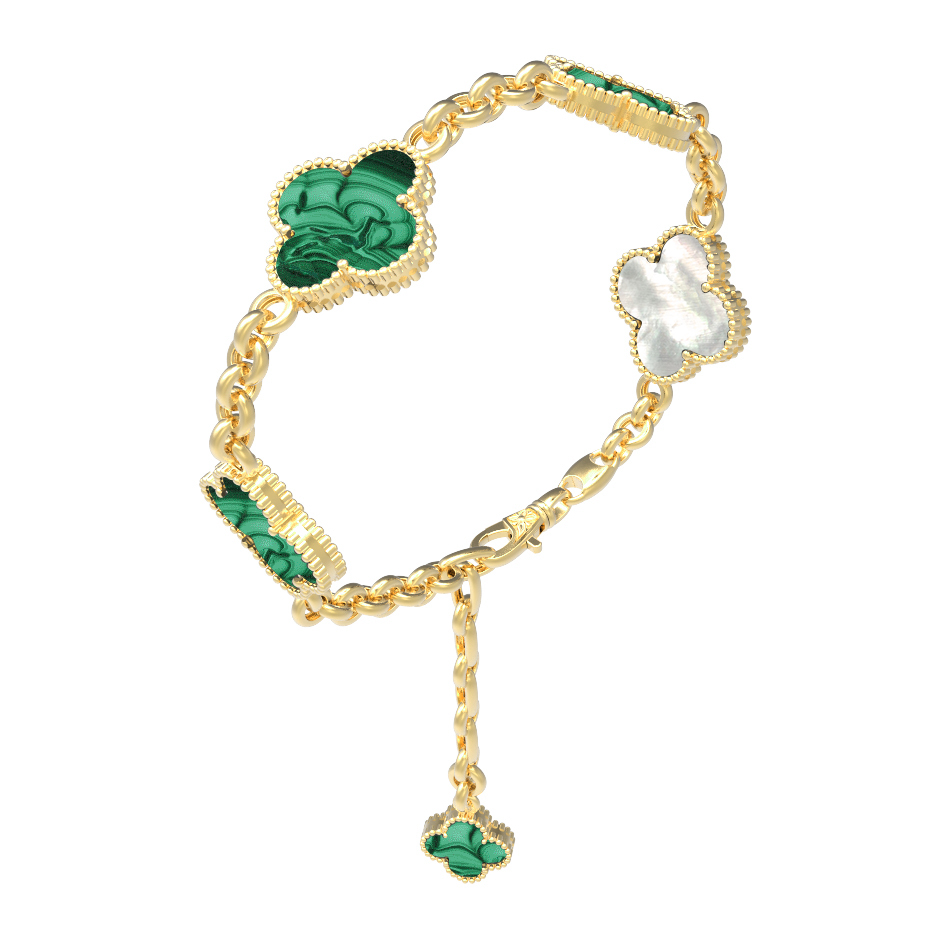 Украшение декорировано 5 вставками, среди которых загадочный зеленый малахит с его уникальным природным рисунком и нежный перламутр, переливающийся мягкими бликами. Такое сочетание цветов делает браслет универсальным аксессуаром, который легко дополняет как повседневные, так и вечерние образы. Качественное исполнение и продуманные детали позволяют этому изделию стать изысканным акцентом вашего стиля.