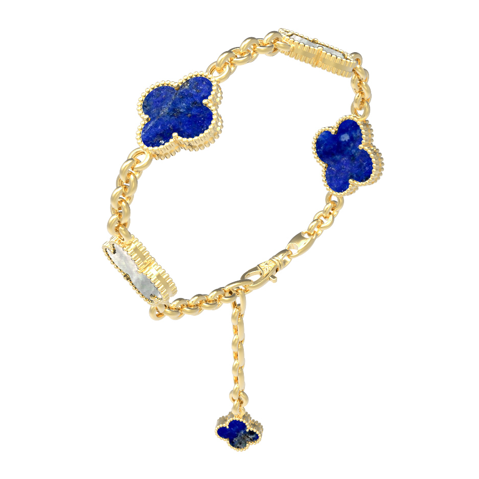 Центральными элементами выступают 3 вставки: глубокий синий лазурит и нежный переливающийся перламутр. Контраст между насыщенным цветом лазурита и мягким сиянием перламутра создает гармоничную композицию, которая приковывает взгляд. Тщательно проработанные детали делают этот браслет универсальным украшением, подходящим как для женщин, так и для мужчин, ценящих премиальное качество и уникальный стиль.