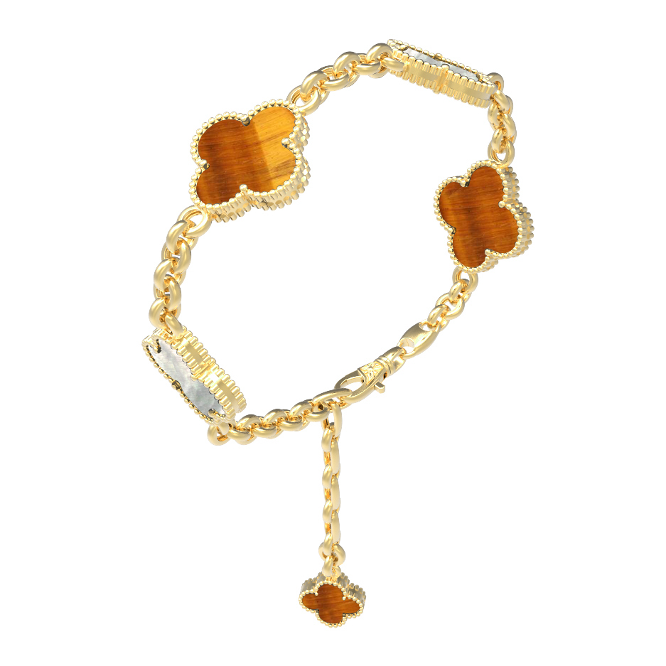 В центре композиции — 3 вставки: очаровательный перламутр и насыщенный тигровый глаз. Контраст оранжевого оттенка тигрового глаза и нежного переливающегося перламутра создает неповторимую игру цвета на запястье. Плетение цепочки, дополненное изящным подвесным элементом, подчеркивает статусность и внимание к деталям.