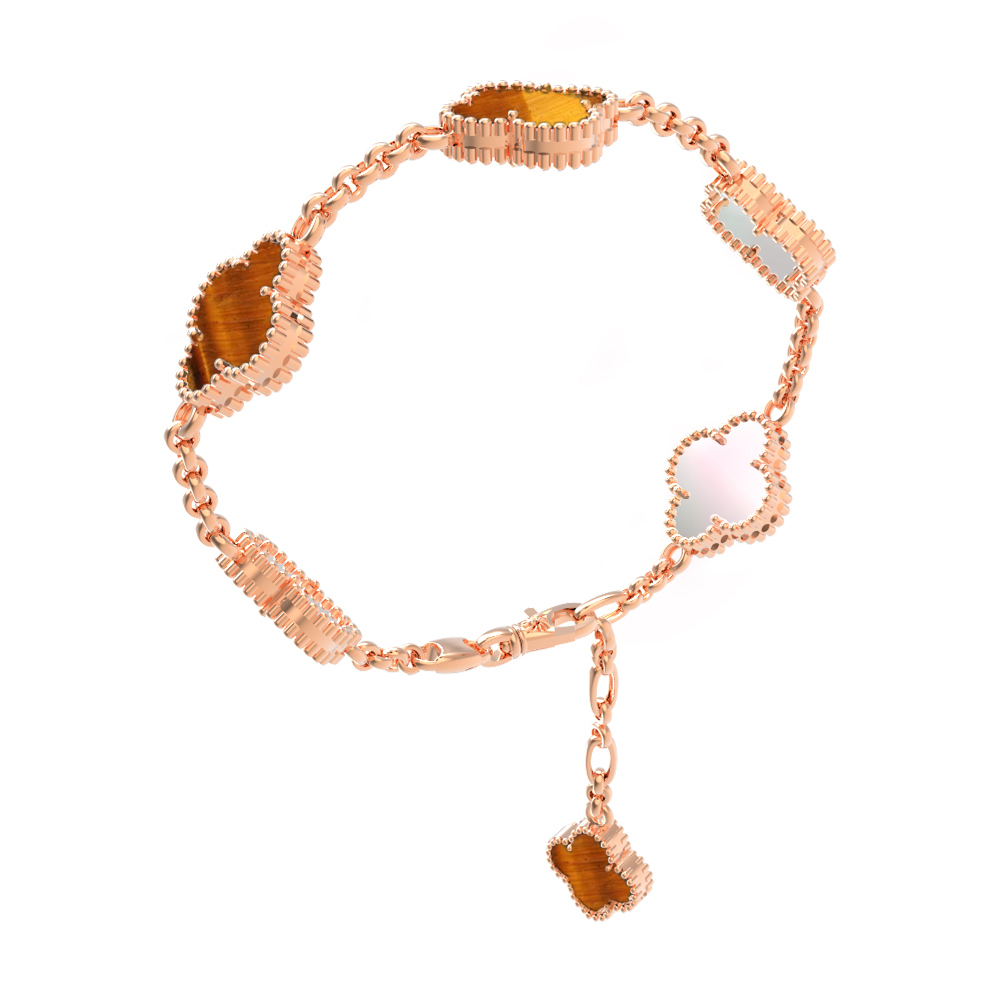 Изысканный браслет из красного золота 585 пробы станет утонченным акцентом вашего образа. Изделие из коллекции De Luxe — Клевер выполнено в популярном дизайне клевер, который олицетворяет удачу и гармонию. Деликатная цепочка дополнена шестью вставками: благородным перламутром нежного жемчужного оттенка и теплым тигровым глазом с характерным оранжевым переливом. Такое сочетание материалов создает выразительный контраст, подчеркивающий безупречный вкус владельца.