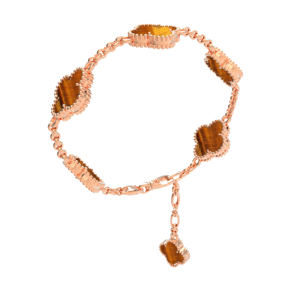 Золотой браслет с тигровым глазом из коллекции De Luxe — Клевер — это изысканное ювелирное украшение, которое станет идеальным завершением вашего образа. Изделие выполнено из благородного красного золота 585 пробы, что придает аксессуару теплый, насыщенный оттенок. Дизайн браслета вдохновлен классическим символом удачи: шесть элементов в форме четырехлистного клевера гармонично соединены между собой, создавая утонченную и динамичную композицию на запястье.