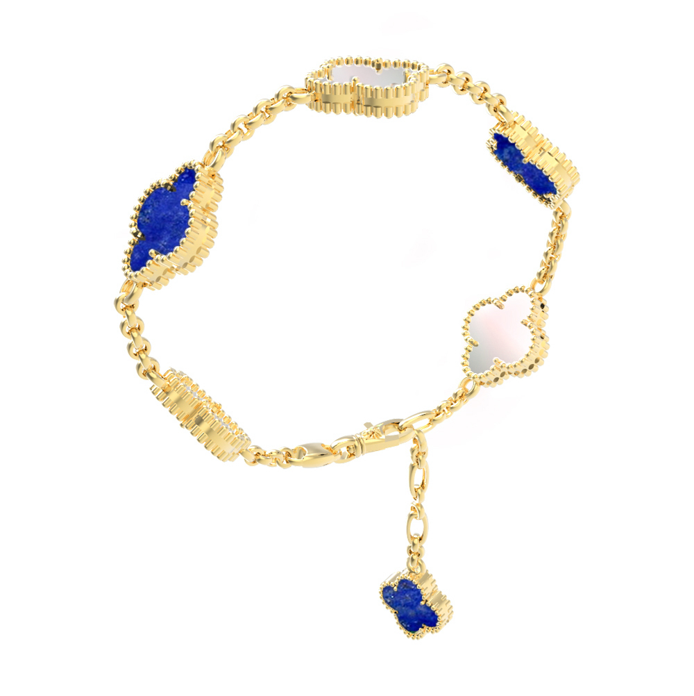Изысканный браслет из лимонного золота 585 пробы из коллекции De Luxe — Клевер станет идеальным дополнением вашего образа. Это украшение объединяет в себе благородство драгоценного металла и очарование природных камней. Дизайн изделия в форме клевера подчеркивает утонченный вкус своего владельца. В качестве вставок использованы синий лазурит и нежный перламутр, которые создают гармоничный контраст с теплым оттенком лимонного золота.