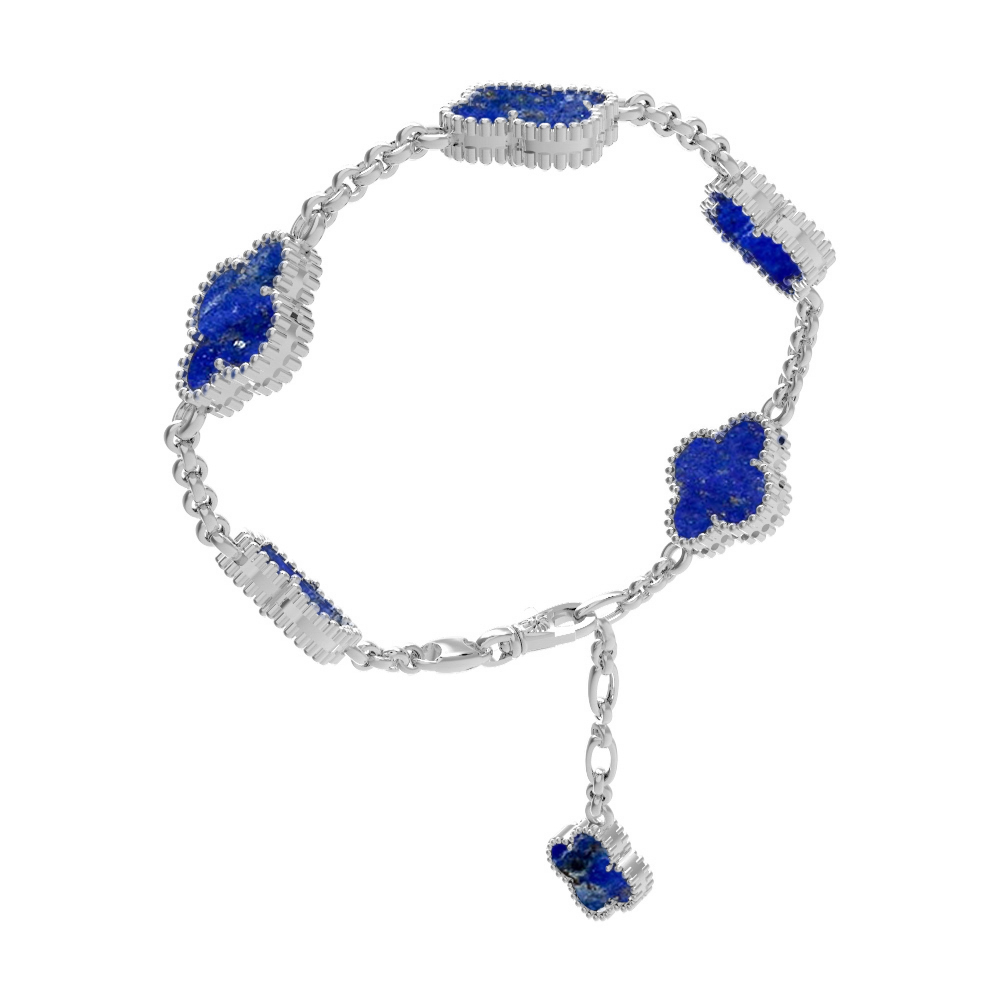 Центральными элементами композиции выступают 6 вставок из натурального лазурита насыщенного синего цвета. Глубокий, небесный оттенок камней гармонично сочетается с холодным сиянием металла, создавая выразительный контраст. Такой браслет универсален: он одинаково эффектно смотрится как на женской, так и на мужской руке, добавляя акцент в повседневный или вечерний аутфит.
