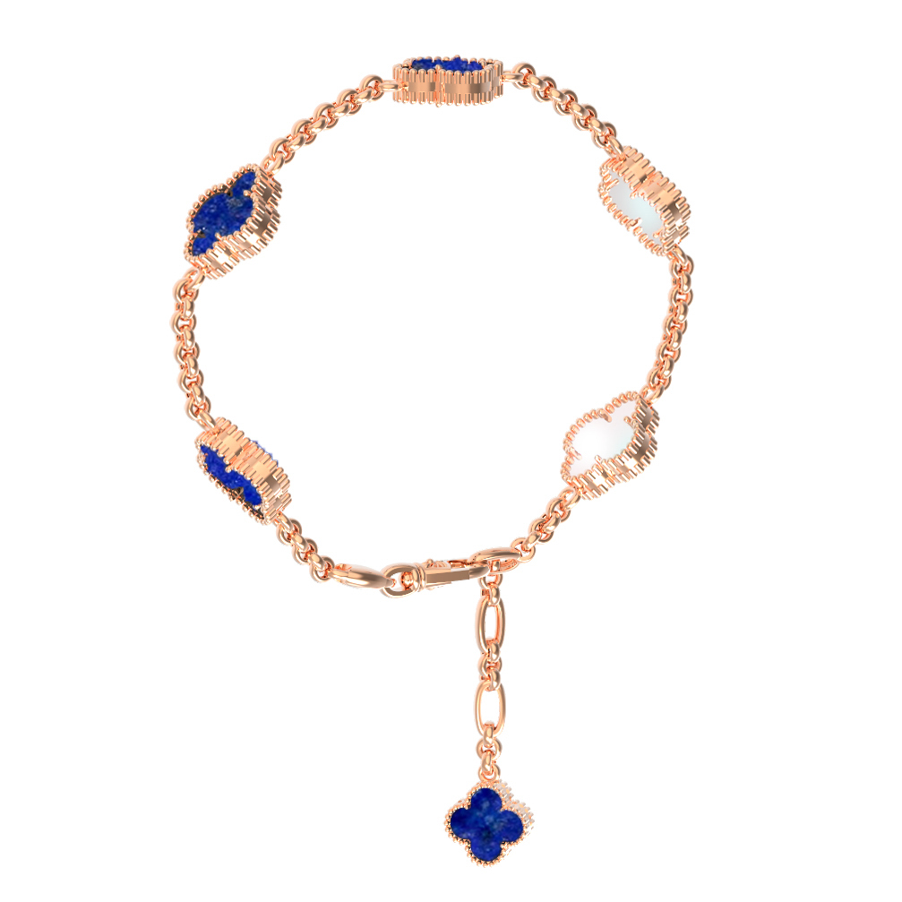 В центре композиции расположены 6 вставок, чередующих в себе глубокий синий лазурит и нежный перламутр. Контраст между насыщенным цветом камней и мягким переливом перламутра создает уникальный визуальный эффект, притягивающий взгляды. Благодаря продуманному исполнению, этот браслет подойдет как женщинам, так и мужчинам, стремящимся добавить в свой стиль нотку изысканности. Украшение великолепно смотрится как самостоятельный аксессуар, так и в сочетании с другими ювелирными изделиями, позволяя создавать гармоничные комплекты для любого случая.