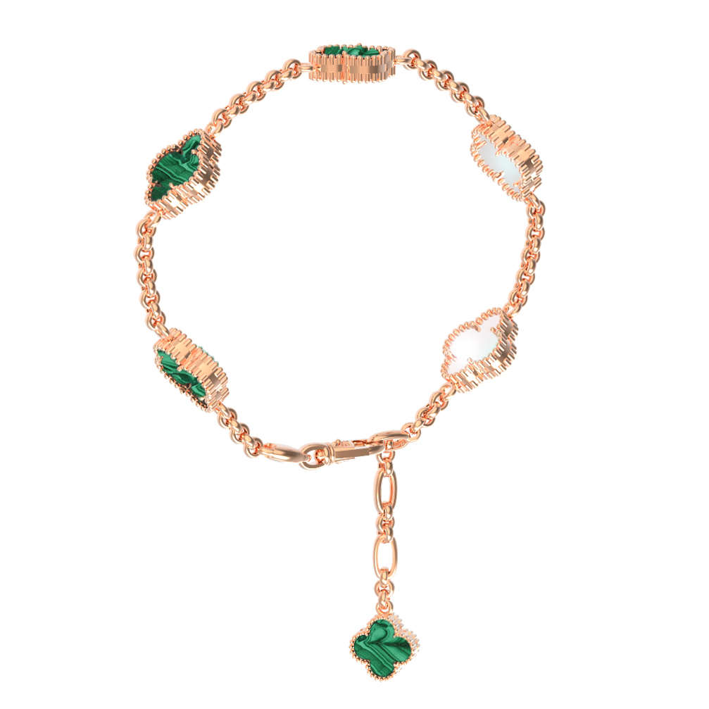 Золотой браслет из коллекции De Luxe — Клевер — воплощение утонченного стиля и природной гармонии. Украшение выполнено из красного золота 585 пробы, чей теплый оттенок идеально подчеркивает красоту натуральных камней. В центре ювелирной композиции — изящный дизайн в форме клевера, который всегда остается символом удачи и элегантности.