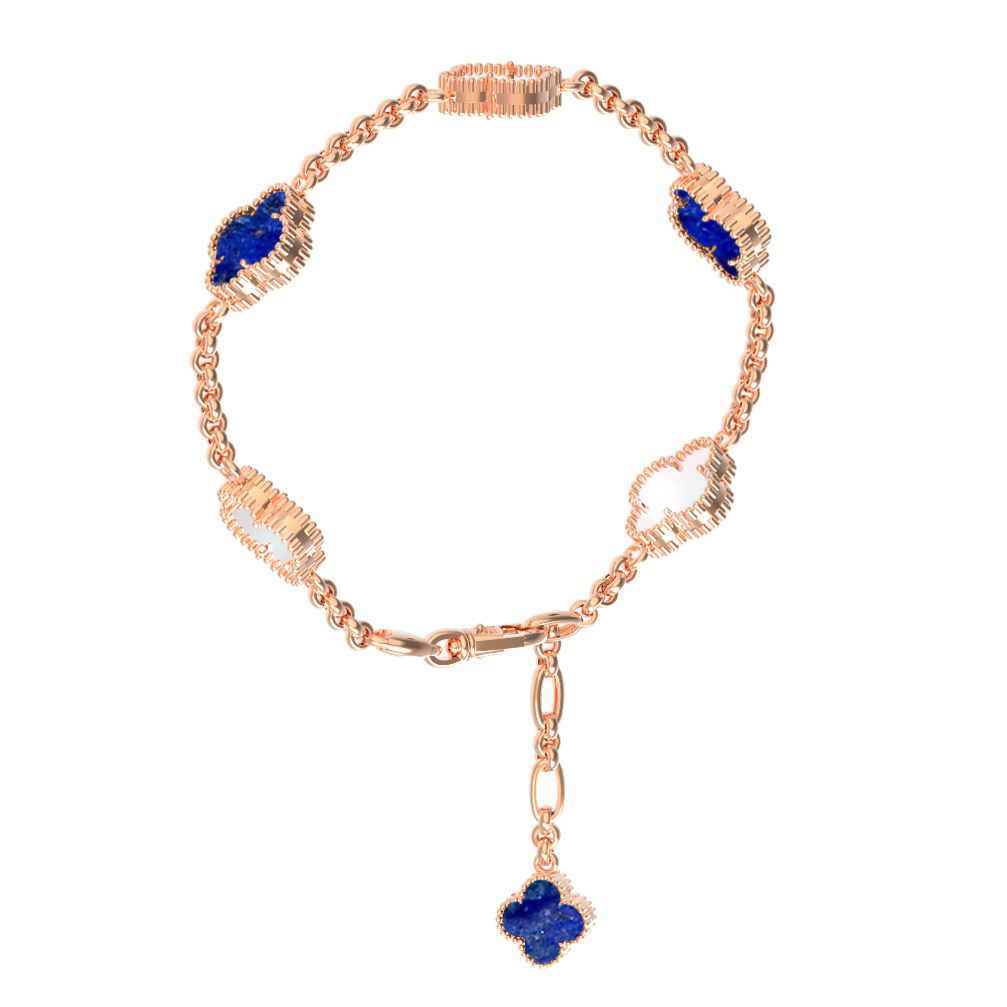 В оформлении браслета использовано три вставки: глубокий синий лазурит и нежный переливающийся перламутр. Контраст между насыщенным цветом лазурита и светлым сиянием перламутра создает выразительный акцент на запястье, привлекая внимание к каждой детали исполнения. Утонченная цепочка надежно фиксируется на руке, позволяя с комфортом носить украшение ежедневно или дополнять им вечерний образ.