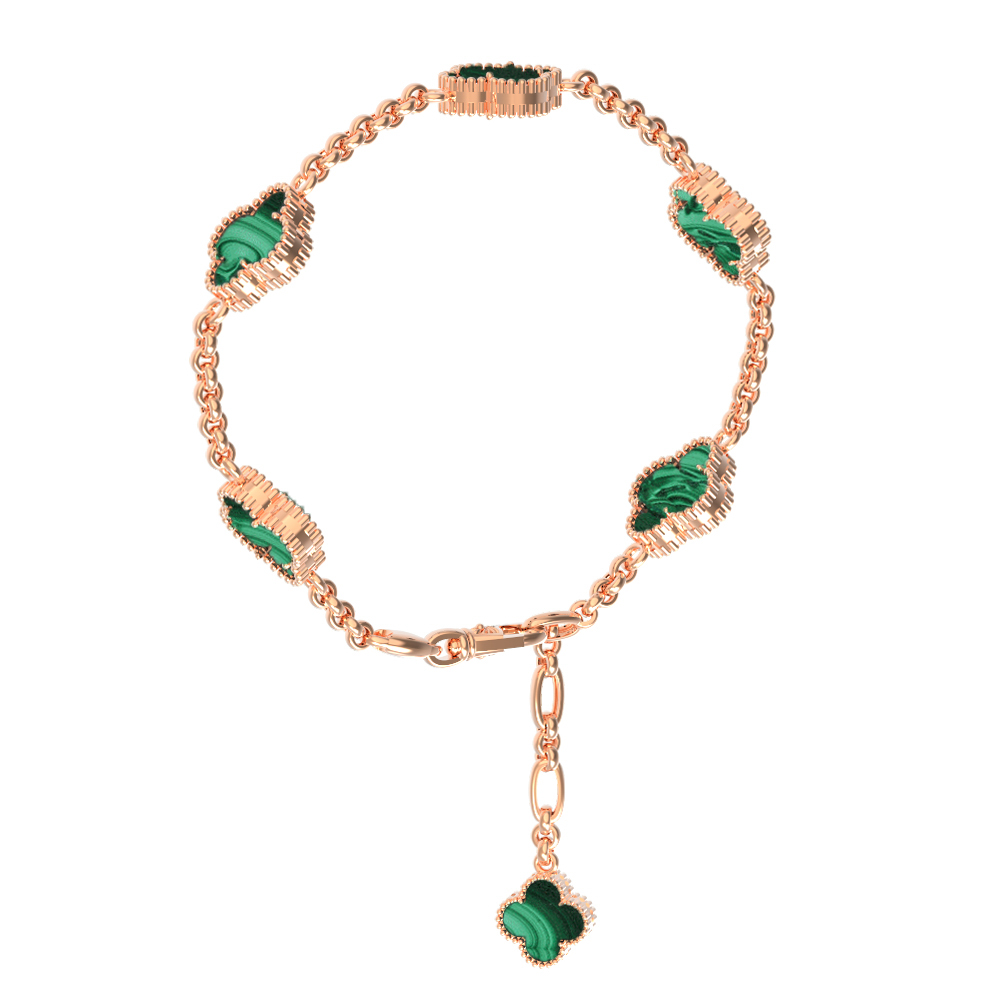 Изящный золотой браслет из коллекции De Luxe — Клевер станет безупречным акцентом вашего образа. Дизайн изделия вдохновлен природными мотивами: тонкая цепочка украшена шестью вставками в форме клевера, которые гармонично дополняют друг друга. Насыщенный зеленый цвет малахита великолепно сочетается с мягким сиянием красного золота 585 пробы, подчеркивая статусность и безупречный вкус владельца.
