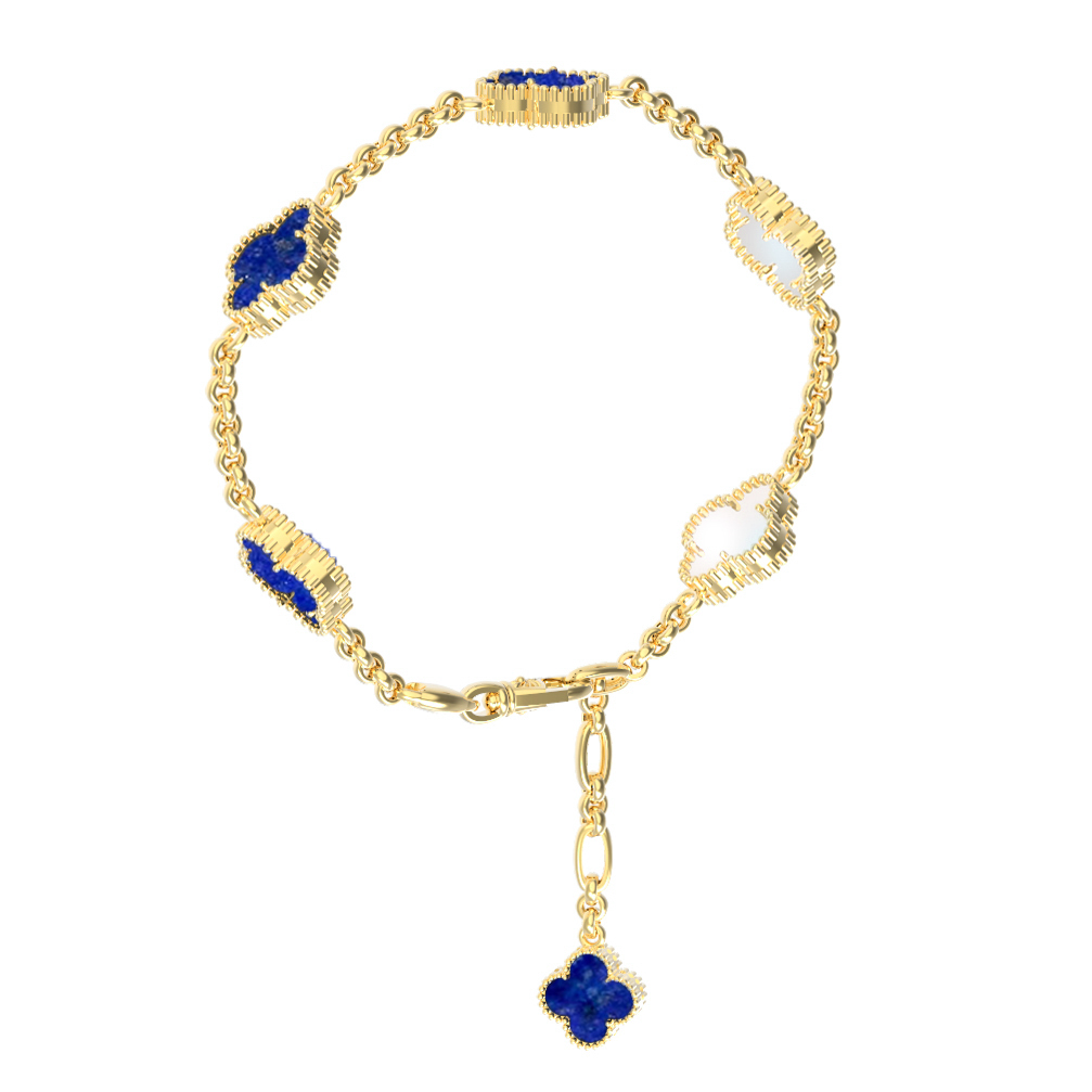В этой модели гармонично сочетаются контрастные природные камни: глубокий синий лазурит и нежный перламутр. Контраст цветов делает браслет выразительным и запоминающимся аксессуаром. Всего в изделии предусмотрено 6 вставок, каждая из которых бережно закреплена в золотую оправу, обеспечивая долговечность и эстетичность. Благодаря универсальному стилю, этот браслет подойдет как для женщин, так и для мужчин, подчеркивая статус и безупречный вкус владельца.
