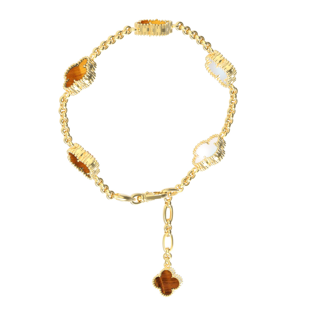 Этот браслет из лимонного золота с тигровым глазом и перламутром великолепно дополнит повседневный или вечерний наряд. Изделие прекрасно сочетается с другими украшениями бренда, позволяя создавать полноценные комплекты для завершенного образа. Выбирая украшения из серии De Luxe — Клевер, вы отдаете предпочтение качеству исполнения и актуальному дизайну, который не теряет своей привлекательности со временем.
