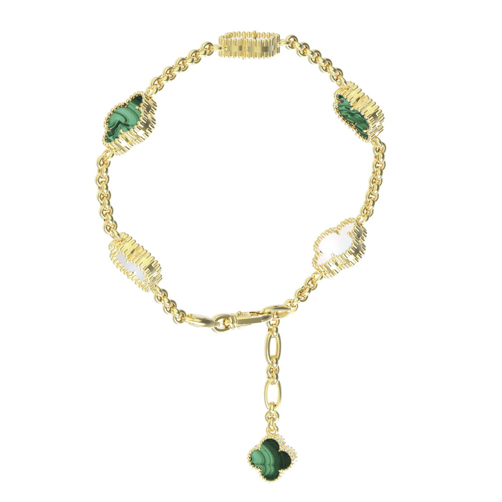 Особое очарование браслету придает искусная комбинация материалов. В качестве вставок использованы натуральный малахит глубокого зеленого цвета и нежный перламутр с его неповторимым сиянием. Гармоничное сочетание трех вставок с мягким блеском лимонного золота создает выразительный визуальный контраст, приковывающий взгляды. Каждая деталь изделия тщательно проработана, чтобы подчеркнуть природную красоту камней и премиальное качество исполнения.