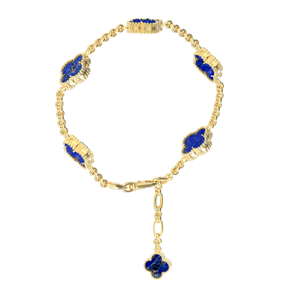 Изысканный браслет из коллекции De Luxe — Клевер станет безупречным акцентом вашего образа. Дизайнерское решение в форме четырехлистного клевера гармонично сочетает в себе благородный блеск лимонного золота 585 пробы и глубокий, насыщенный оттенок натурального лазурита. Это ювелирное украшение олицетворяет элегантность и утонченный вкус, подчеркивая статус владельца.