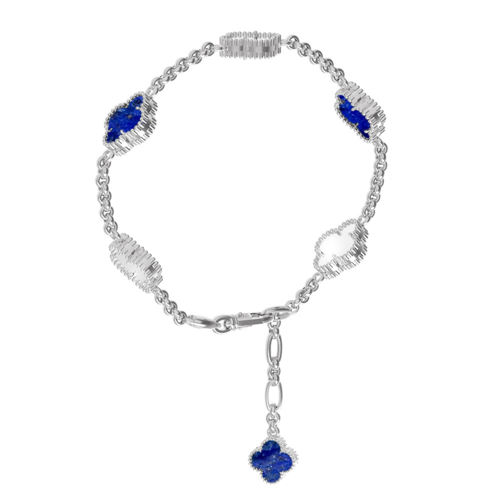 Элегантный браслет из белого золота 585 пробы из коллекции De Luxe — Клевер станет воплощением изысканности в вашем образе. Дизайн изделия выполнен в узнаваемом стиле клевер, который символизирует удачу и гармонию. Холодный блеск благородного металла идеально сочетается с контрастными вставками: глубоким синим цветом лазурита и нежным сиянием перламутра.