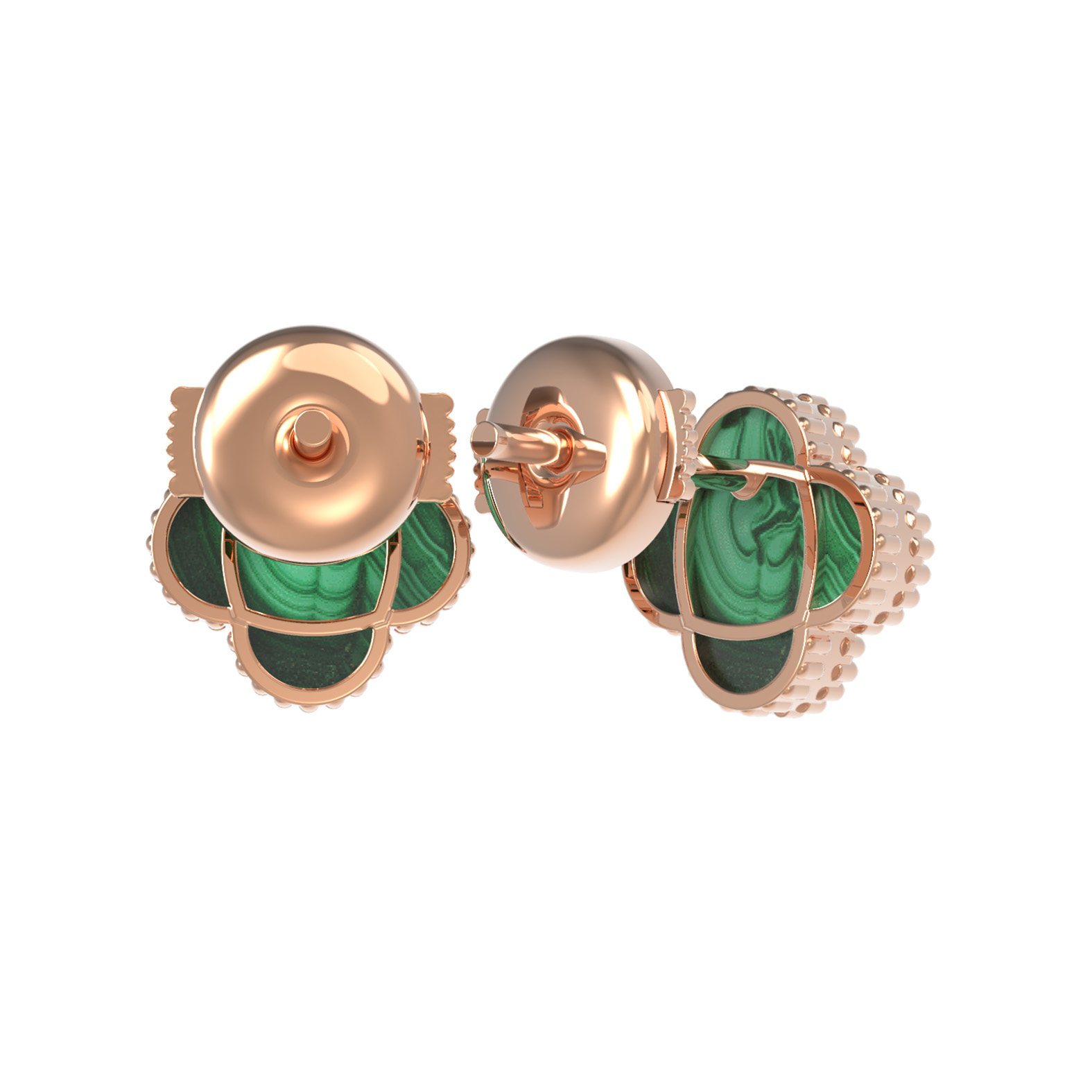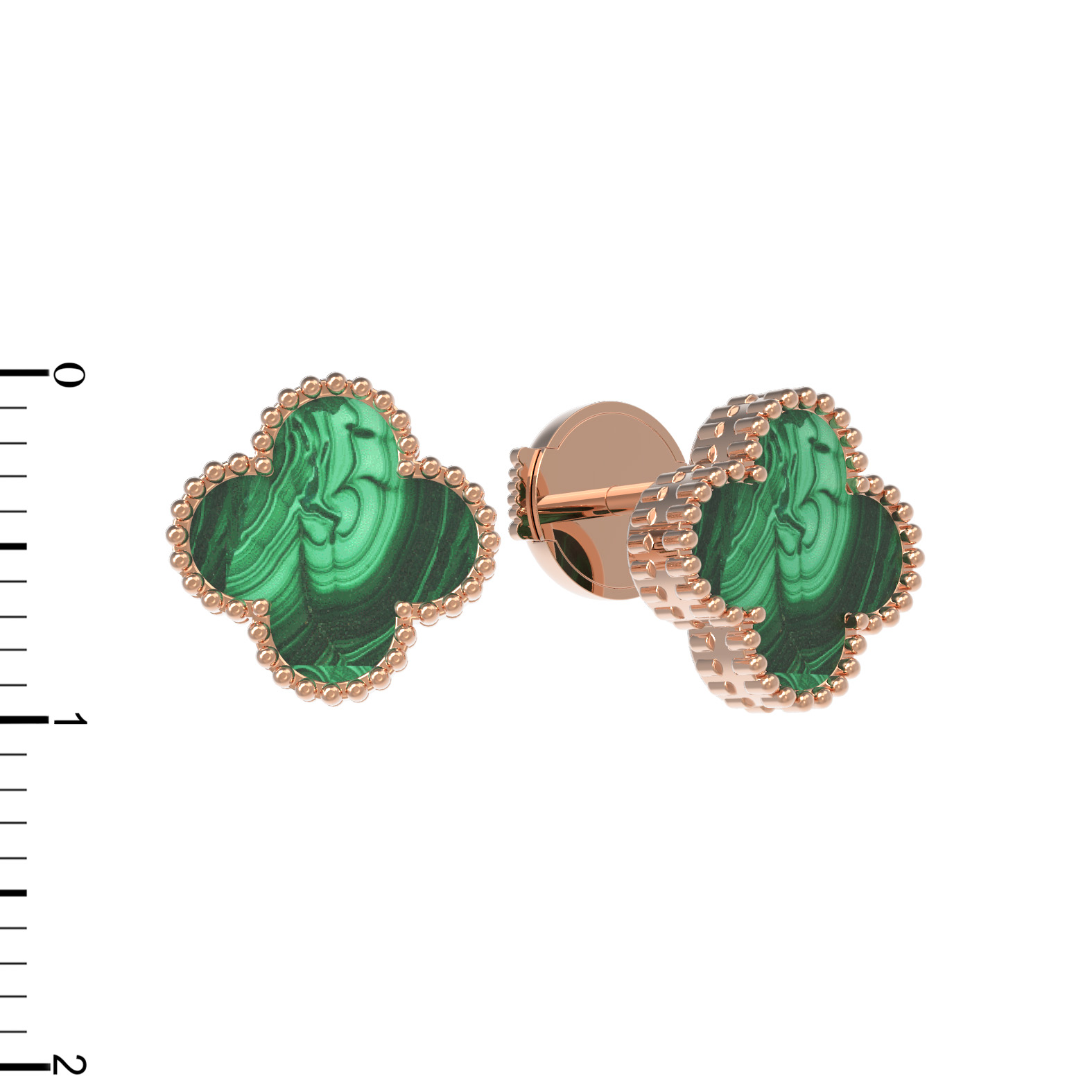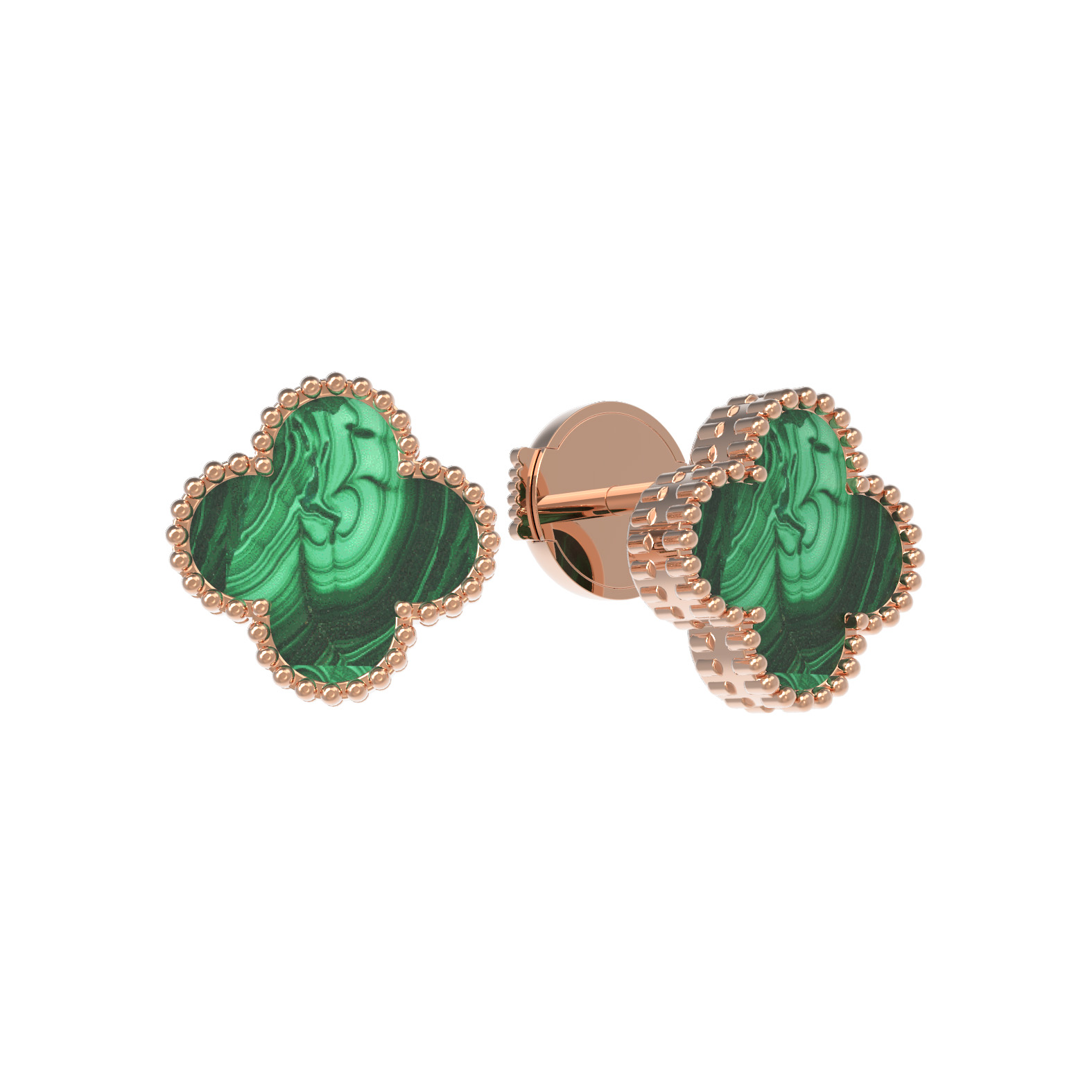 Серьги из красного золота 585 пробы с малахитом — это изысканное украшение, созданное для тех, кто ценит утонченную элегантность и глубокую символику. Дизайн изделия в форме четырехлистного клевера является воплощением удачи и благополучия, что делает эти серьги прекрасным дополнением любого образа. Насыщенный зеленый цвет вставок из натурального малахита гармонично сочетается с теплым блеском красного золота, создавая выразительный акцент.