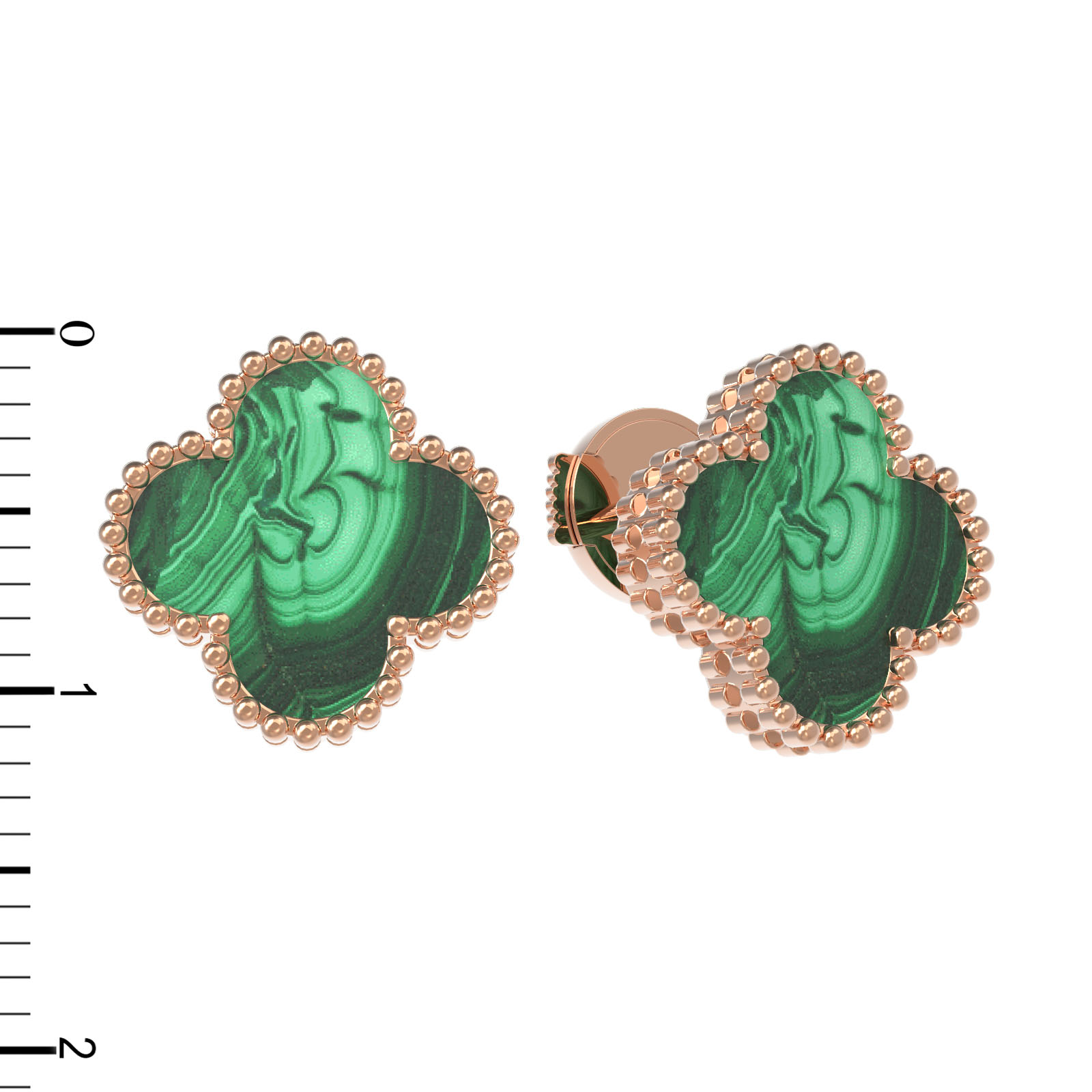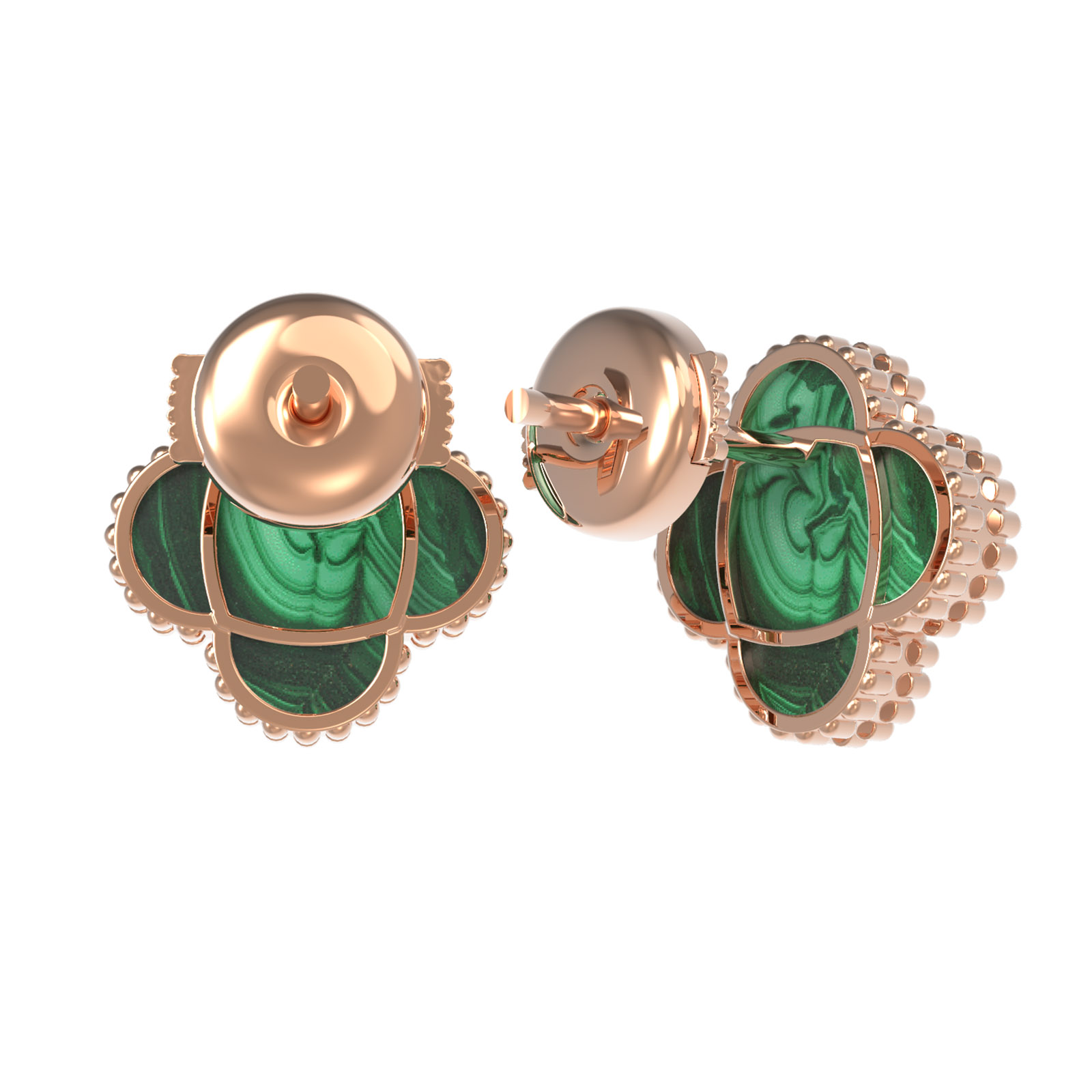 Центральным элементом композиции стали две вставки из натурального малахита глубокого зеленого цвета. Природный узор камня делает каждую пару уникальной, создавая неповторимый контраст с теплым оттенком красного золота. Окантовка в технике зерни по краю клевера придает изделию дополнительный объем и изысканный блеск, который мягко переливается при каждом движении.