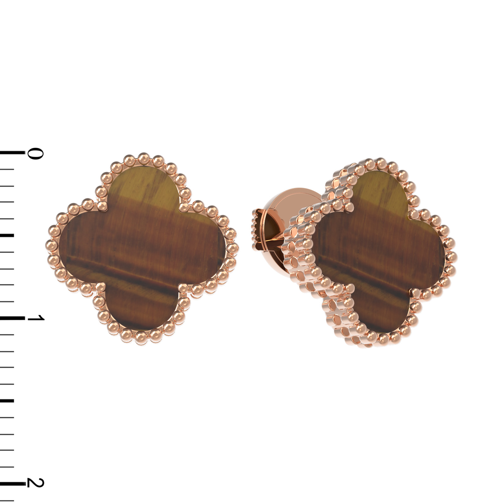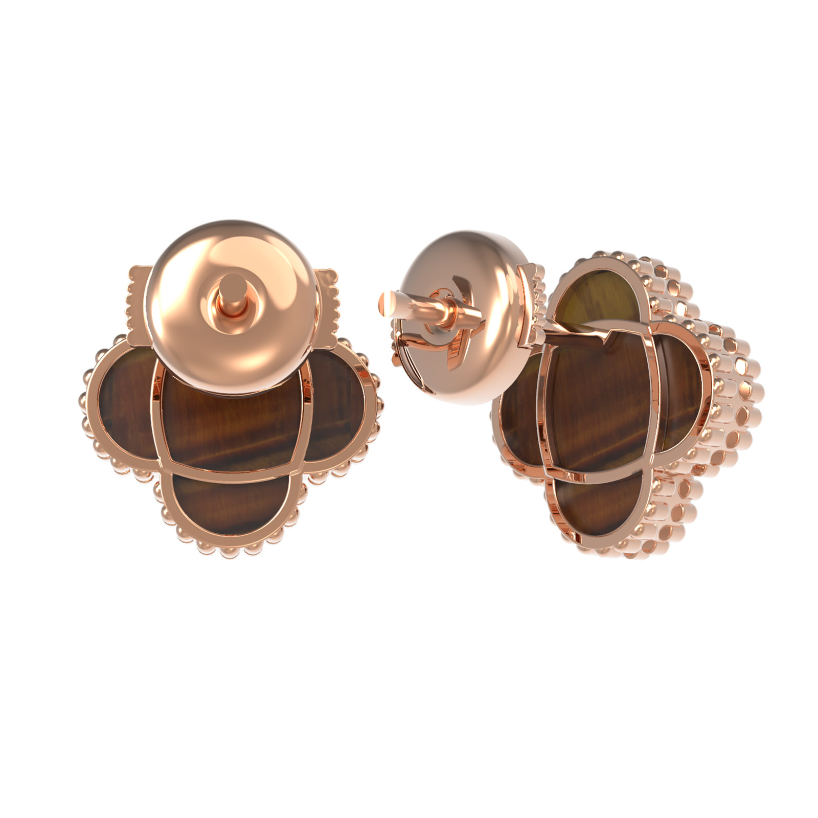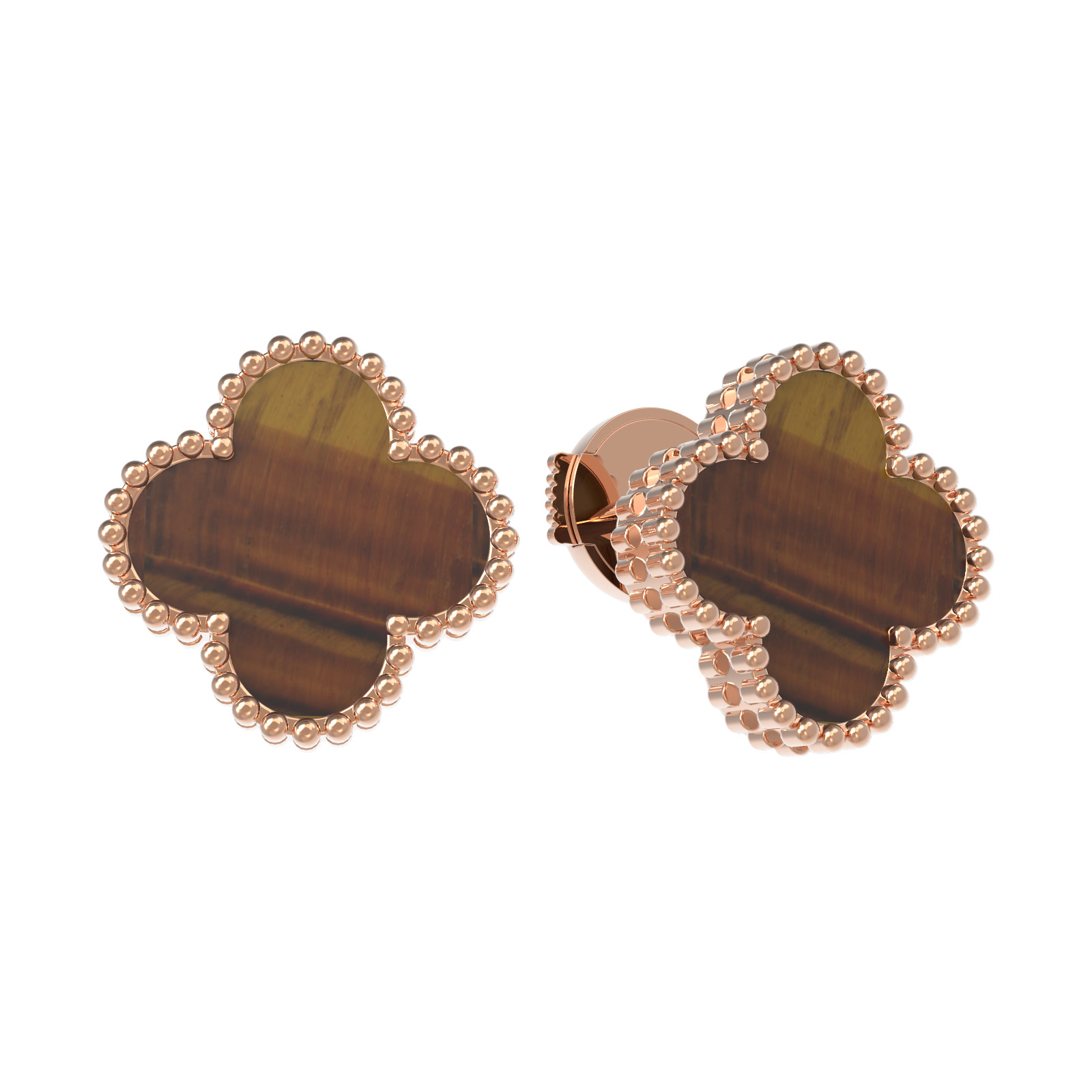 Центральным элементом композиции является дизайн в виде четырехлистного клевера, ставший воплощением стиля и утонченности. В центре каждого цветка расположена вставка из натурального тигрового глаза. Этот камень отличается глубоким оранжевым оттенком и уникальной шелковистой переливчатостью, которая эффектно контрастирует с драгоценным металлом. В изделии использовано 2 вставки, гармонично дополняющих друг друга.