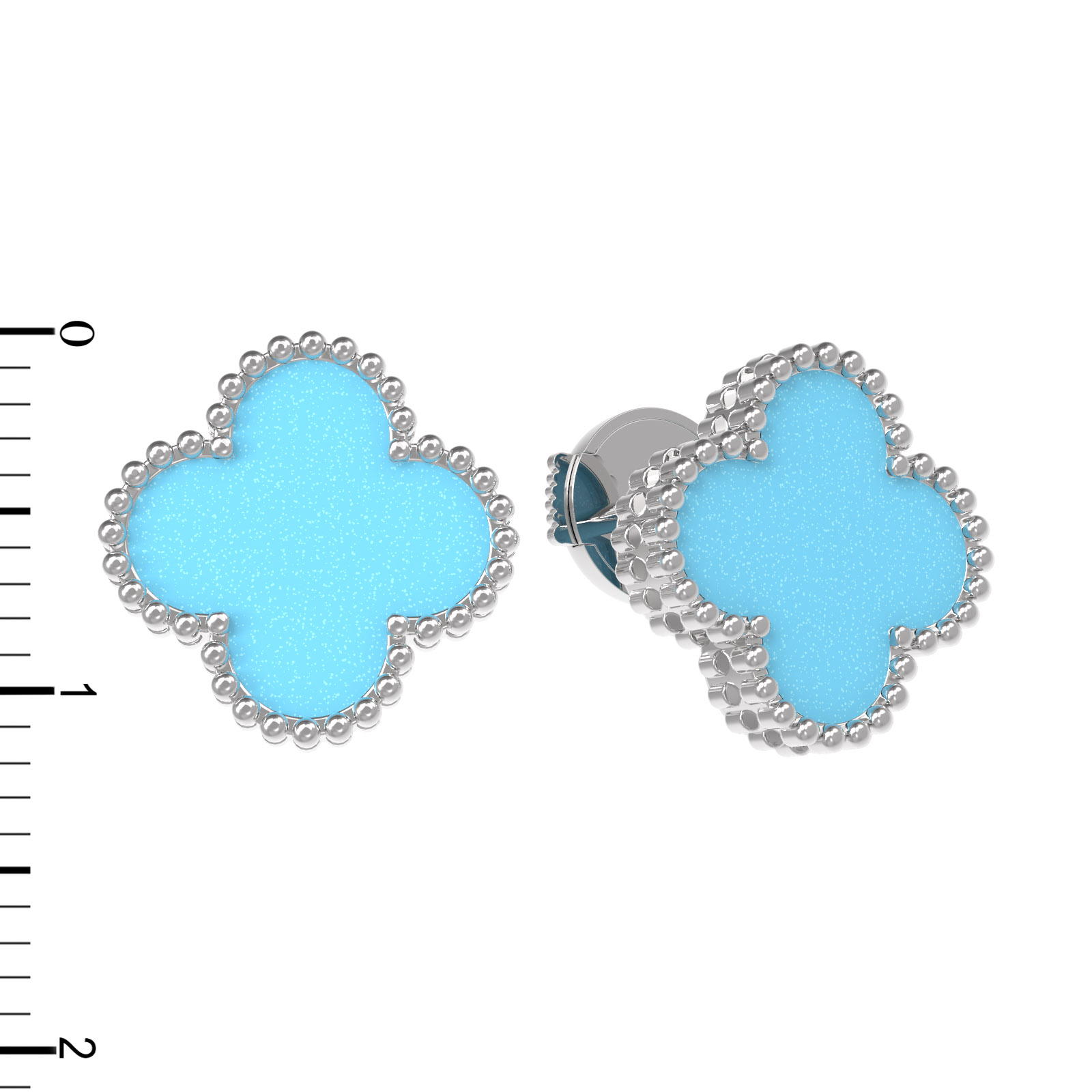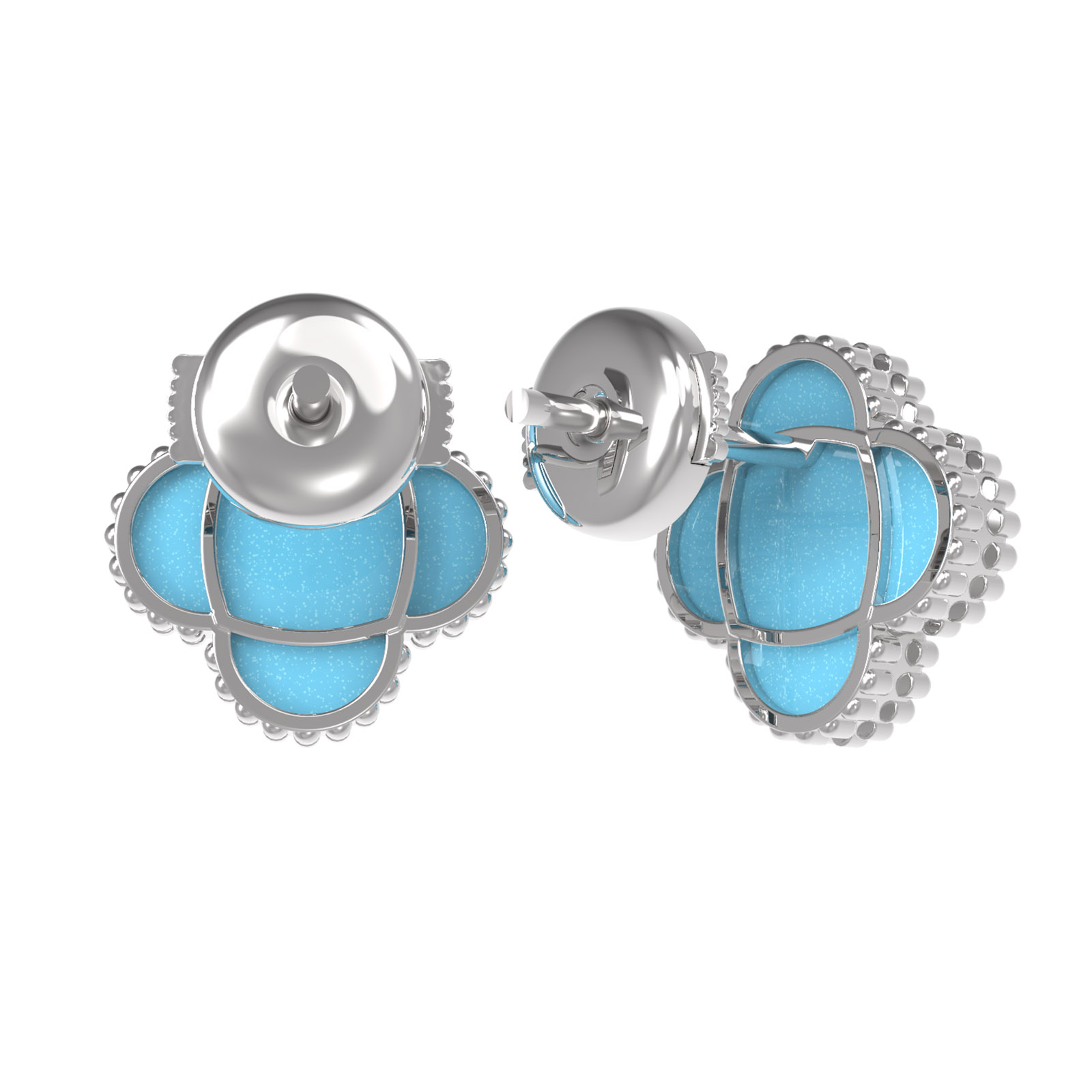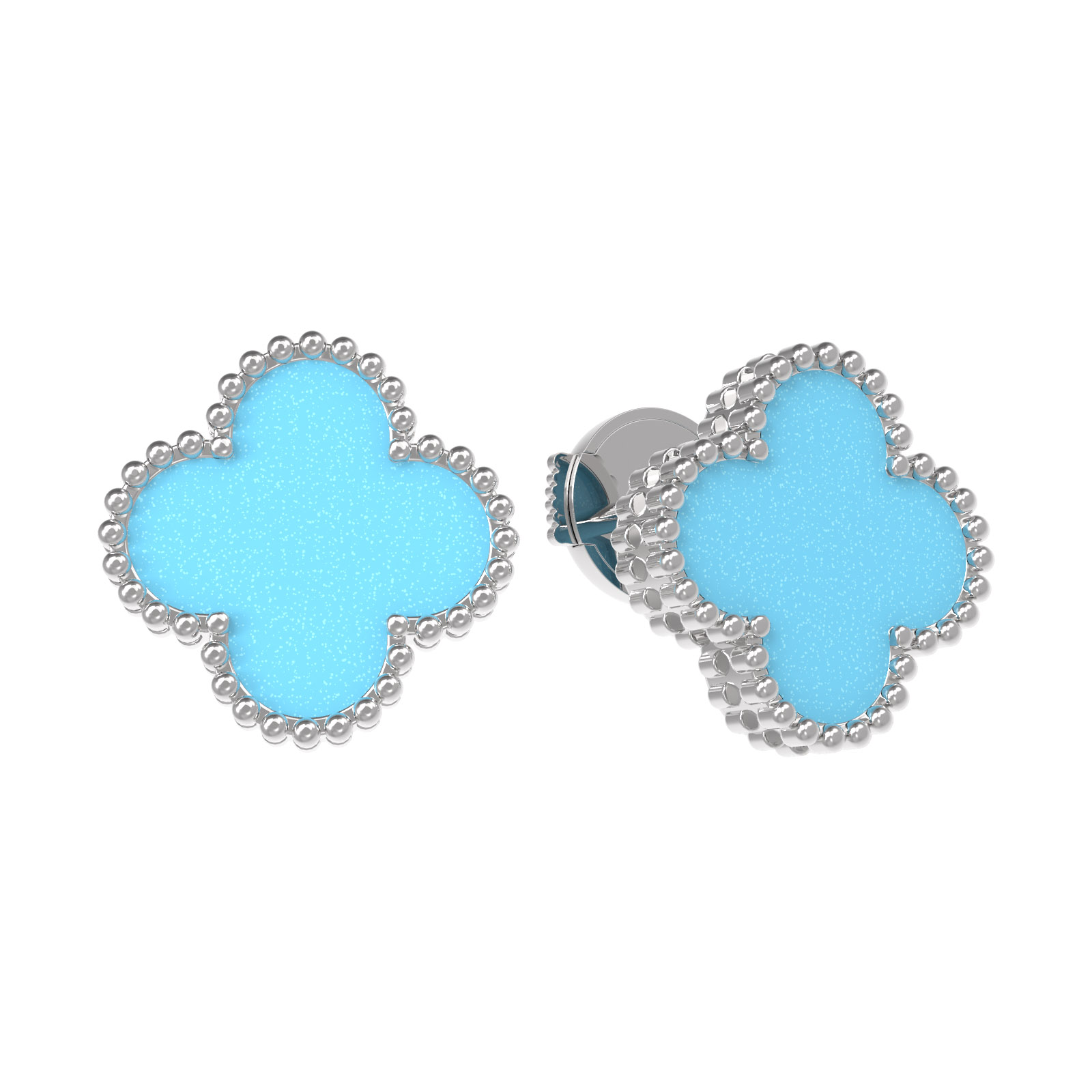 Серьги из белого золота 585 пробы из коллекции De Luxe — Клевер — это воплощение изящества и стиля. Центральным элементом украшения является дизайн в форме клевера, который придает изделию узнаваемый и эстетичный вид. Холодный блеск белого золота гармонично сочетается с насыщенным цветом вставок: каждая серьга украшена бирюзой яркого бирюзового оттенка. Качественная обработка металла и аккуратная инкрустация подчеркивают благородство материалов.