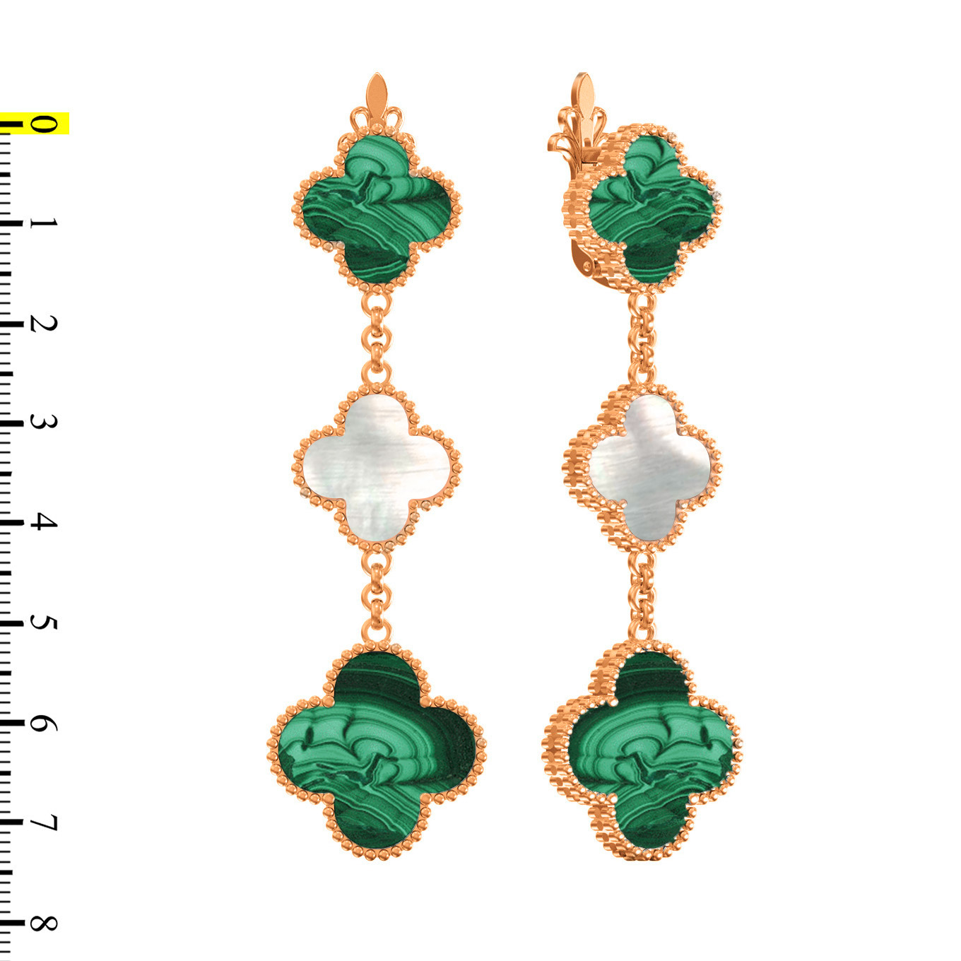 Серьги из красного золота 585 пробы из коллекции De Luxe — Клевер представляют собой гармоничное сочетание классической элегантности и природной красоты. Дизайн изделия вдохновлен символом четырехлистного клевера, который неизменно ассоциируется с удачей и процветанием. Изящная подвесная конструкция украшена четырьмя вставками, чередующими насыщенный зеленый цвет малахита и нежное сияние перламутра, создавая эффектный контраст.