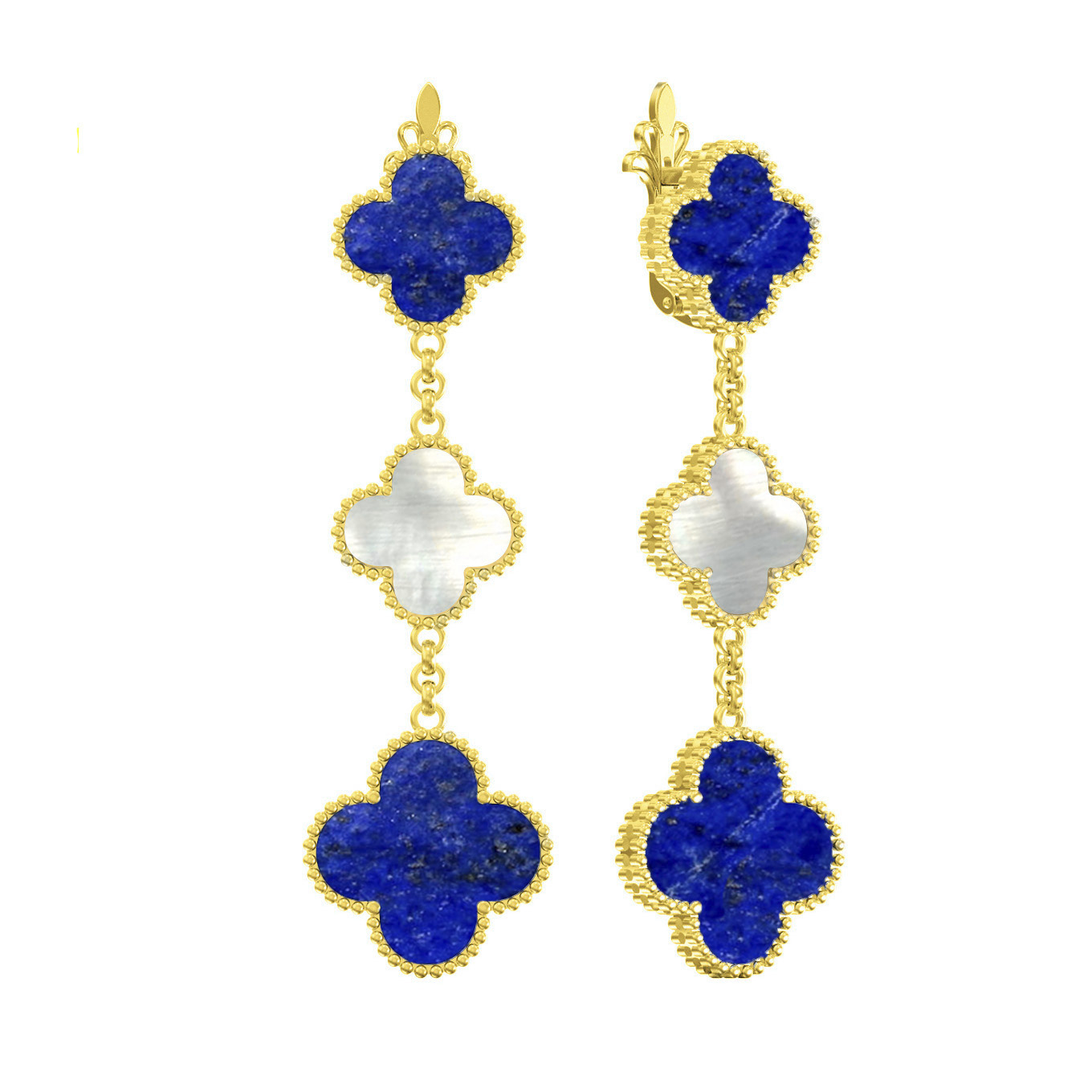 Откройте для себя воплощение утонченного стиля с элегантными длинными серьгами из лимонного золота 585 пробы. Данная модель, представленная в изысканной коллекции De Luxe — Клевер, станет ярким акцентом вашего образа. Дизайн изделия вдохновлен классическим мотивом клевера, который придает украшению особую символичность и неповторимый шарм. В конструкции использованы 4 вставки, гармонично сочетающие глубокий синий оттенок лазурита и нежное сияние перламутра. Контраст между теплым лимонным металлом и благородными камнями создает эффектное визуальное решение, привлекающее внимание к вашему лицу.