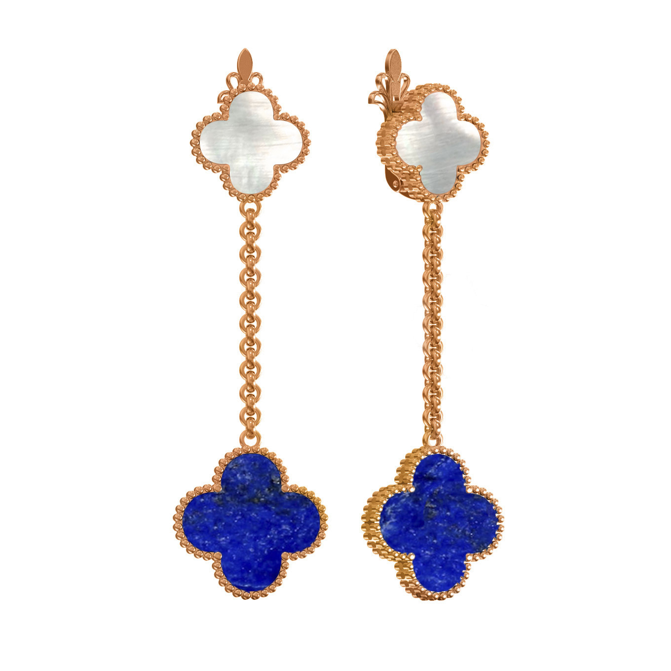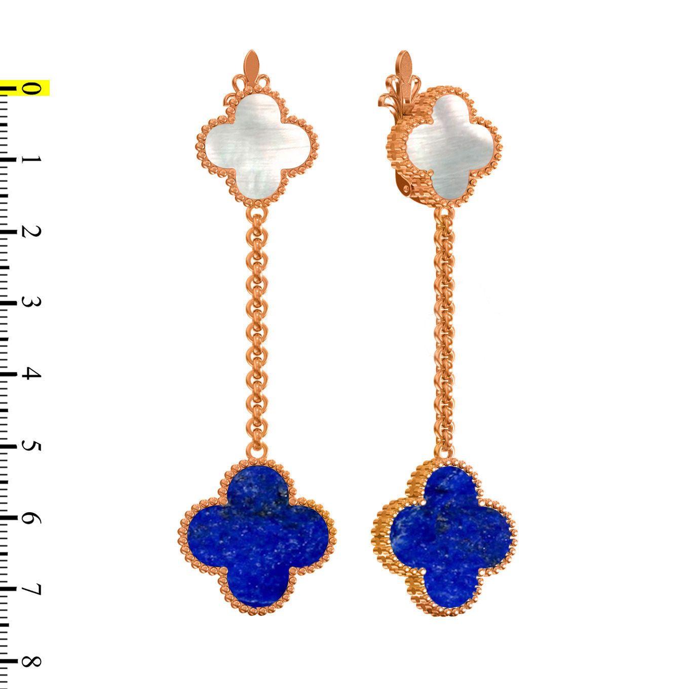 Конструкция серег продумана до мелочей: две вставки из натуральных камней соединены изящной золотой цепочкой, что придает изделию динамику и делает его идеальным акцентом вечернего или делового образа. Благородный оттенок красного золота великолепно обрамляет вставки, подчеркивая их природную красоту. Эти серьги с лазуритом и перламутром можно рассматривать как самостоятельный аксессуар или дополнить ими ювелирные комплекты из той же серии, чтобы создать завершенный и гармоничный ювелирный ансамбль. Качество исполнения подчеркивает статус владельца, а универсальный дизайн позволяет сочетать изделие с любыми образами, от классики до современного минимализма.