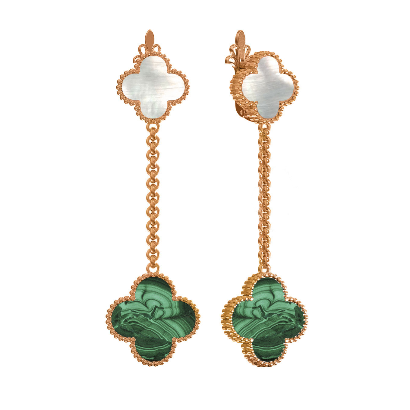 Конструкция серег представляет собой длинные цепочки, соединяющие два элемента в форме клевера. Верхняя часть инкрустирована нежным перламутром с его характерным перламутровым переливом, а нижняя, более массивная часть, украшена насыщенным зеленым малахитом с его уникальным природным рисунком. Всего в изделии использовано 2 вставки, которые создают эффектный контраст между спокойным сиянием перламутра и глубоким цветом малахита.