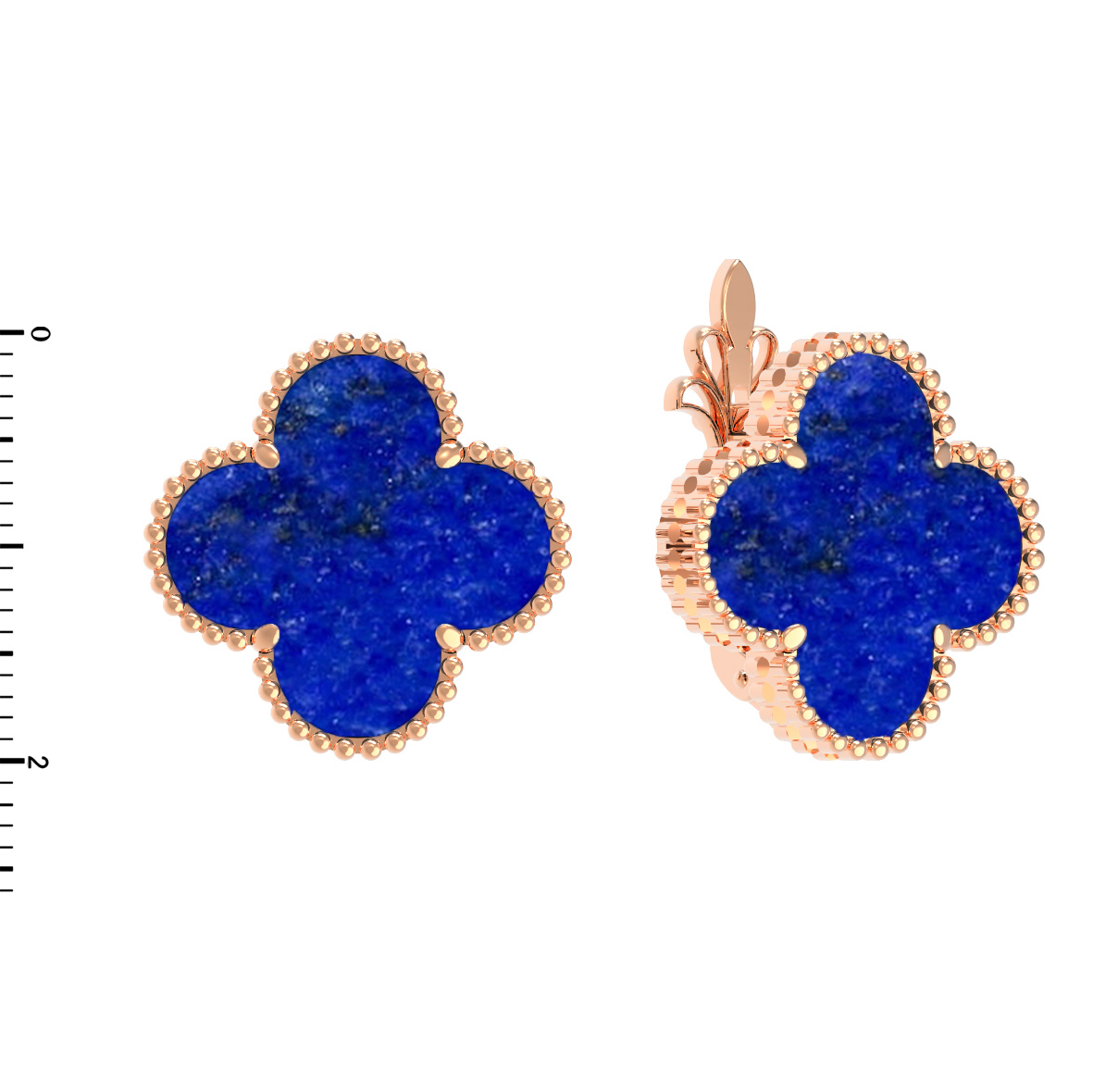 Изделие изготовлено из красного золота 585 пробы, что обеспечивает долговечность и благородный блеск. В центре каждой серьги расположена вставка из натурального лазурита насыщенного синего цвета. Использование 2 вставок лазурита создает выразительный контраст с теплым оттенком красного золота, акцентируя внимание на безупречности линий и формы.