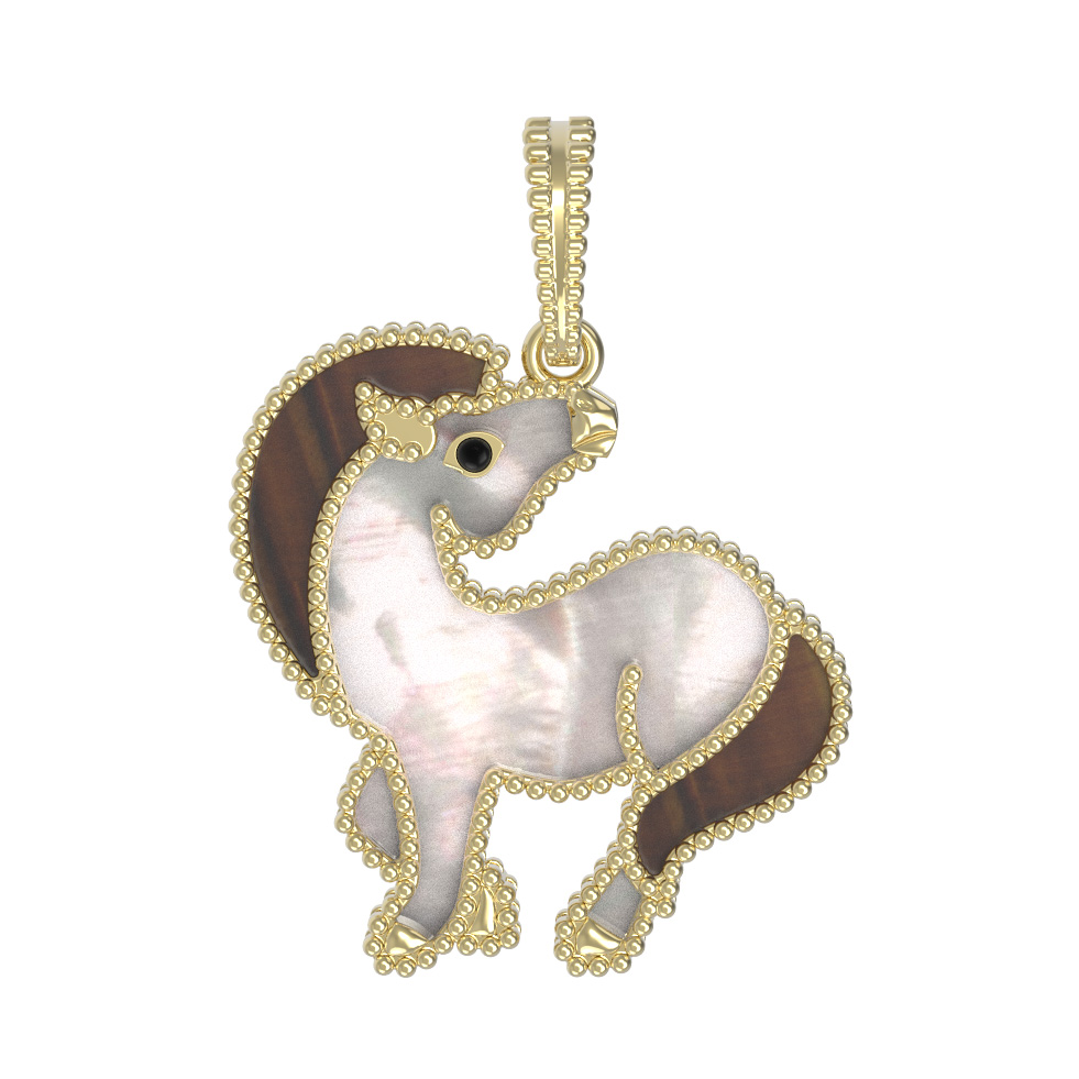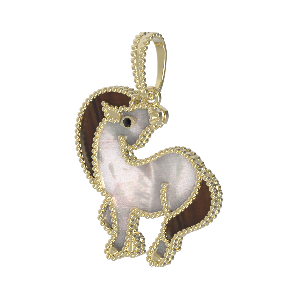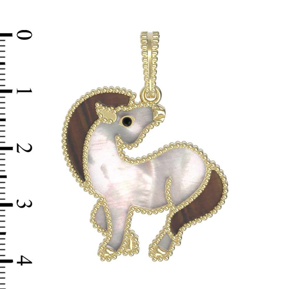 Центральным элементом композиции является искусное сочетание материалов. Корпус фигурки выполнен из нежного перламутра, который завораживает своими переливами, создавая эффект внутреннего свечения. Детали гривы и хвоста оформлены вставками из натурального тигрового глаза оранжевого и черного цветов, добавляя украшению глубины и контрастности. Тонкие акценты эмали завершают образ, делая дизайн выразительным и детализированным.