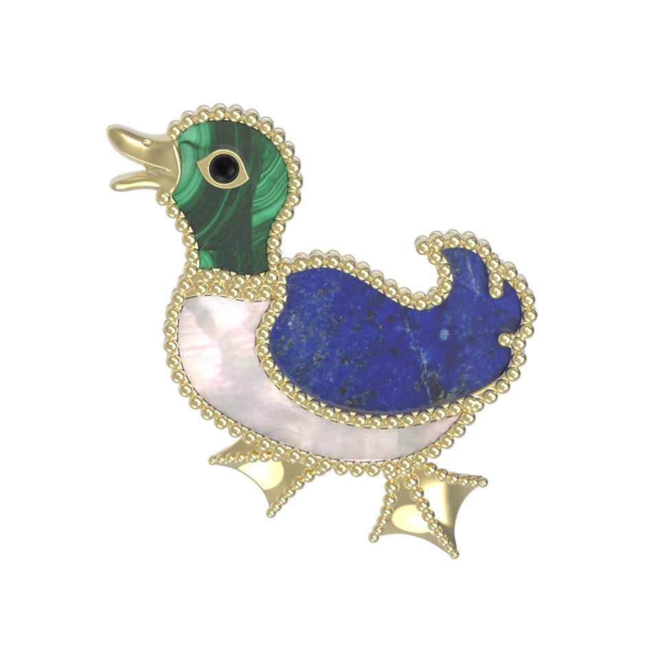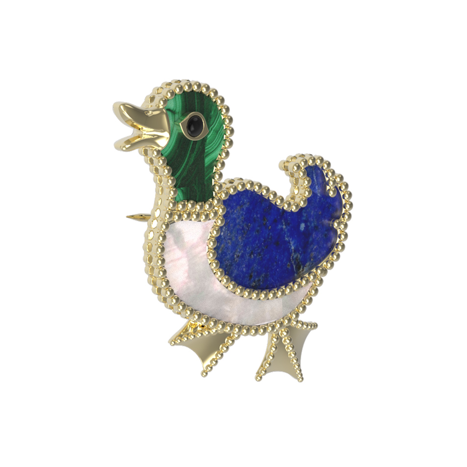 Брошь из лимонного золота c эмалью, лазуритом, малахитом и перламутром