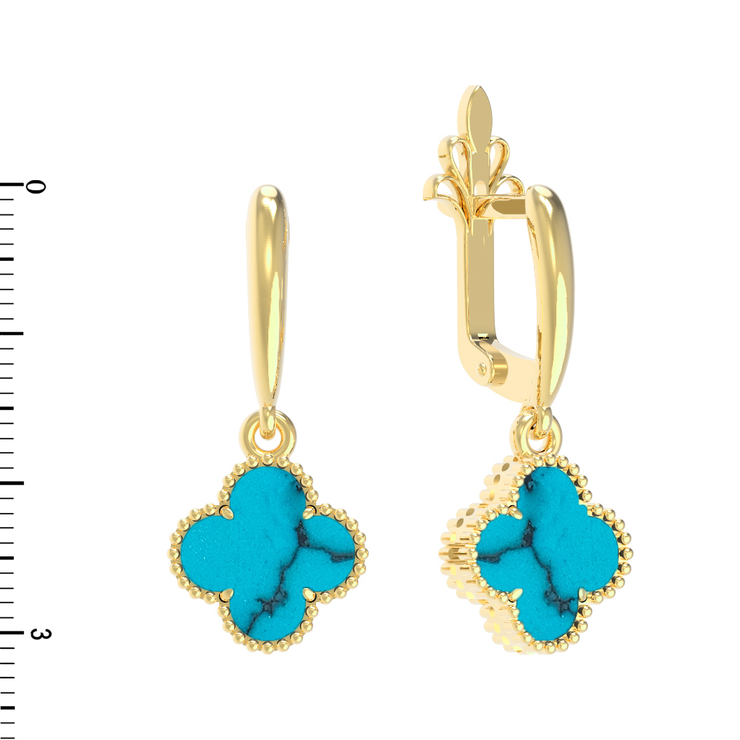 Центральным элементом дизайна выступает узнаваемый и символичный мотив — клевер. Две вставки из натуральной бирюзы бирюзового цвета, обрамленные филигранной золотой оправой, притягивают взгляд своей природной красотой и глубиной оттенка. Лаконичное исполнение позволяет серьгам стать гармоничным дополнением как повседневного делового образа, так и роскошного вечернего наряда.