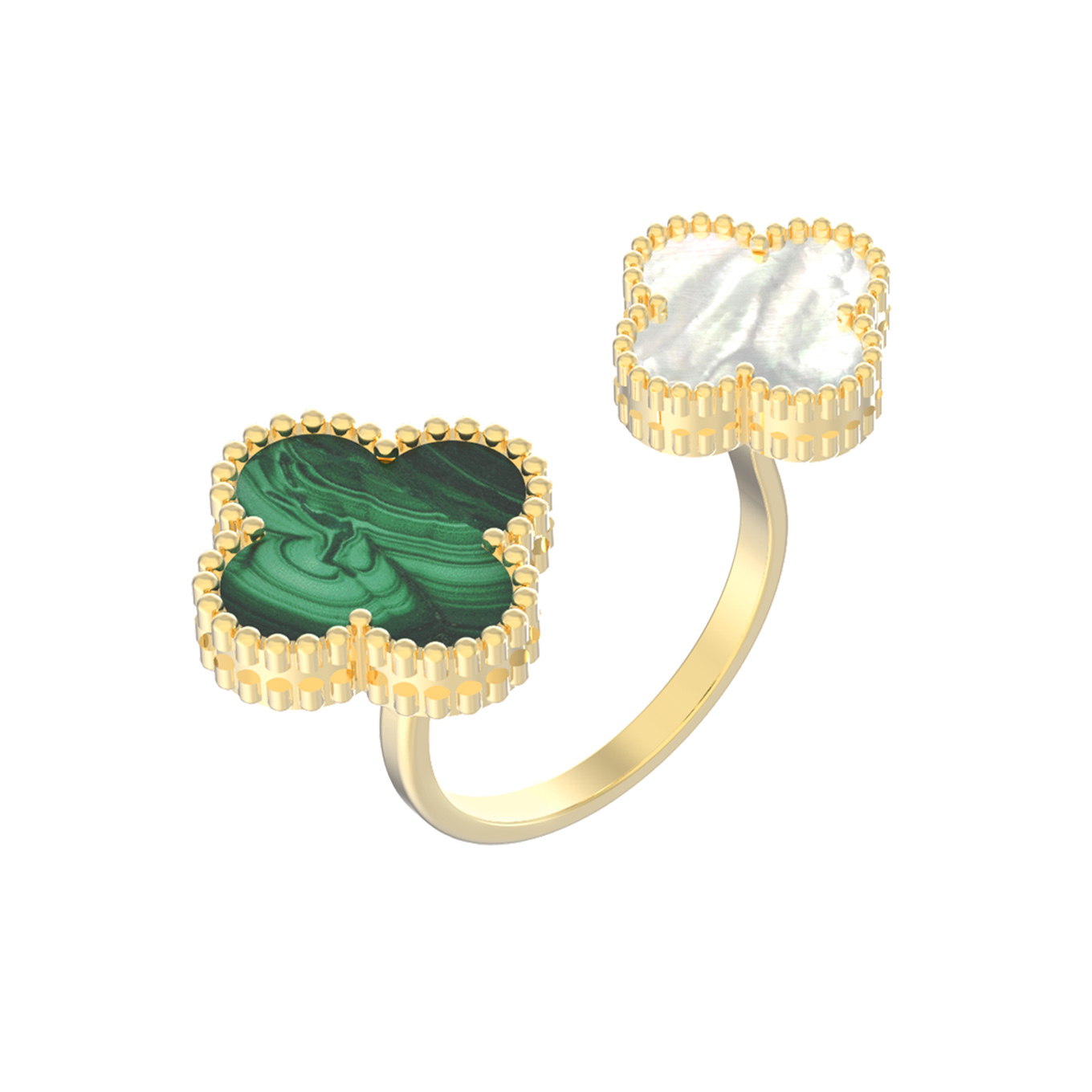 Элегантное кольцо из лимонного золота 585 пробы из коллекции De Luxe — Клевер станет изысканным акцентом вашего образа. Дизайнерское решение в форме клевера объединяет в себе два контрастных мира: насыщенный природный узор малахита зеленого цвета и нежное, переливающееся сияние перламутра. Это сочетание создает гармоничный дуэт, который привлекает внимание своей необычностью и статусным внешним видом.