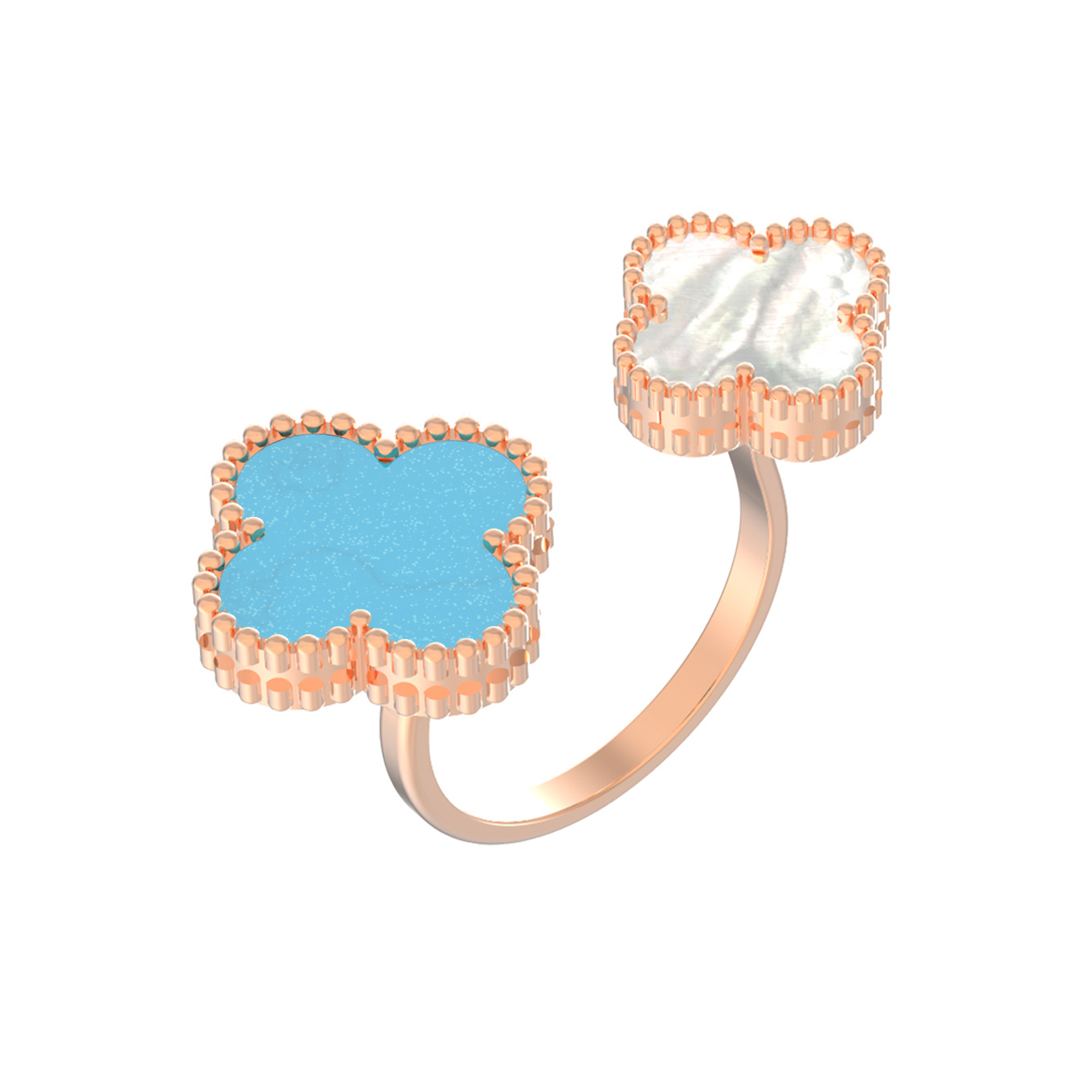 Элегантное кольцо из красного золота 585 пробы — воплощение утонченного стиля и природной красоты. Украшение входит в коллекцию De Luxe — Клевер, дизайн которой вдохновлен символом удачи. Главная особенность изделия — оригинальная форма с двумя элементами в виде клевера, расположенными на разомкнутой шинке. Один лепесток инкрустирован нежной бирюзой, а другой — благородным перламутром, создавая гармоничный контраст оттенков.