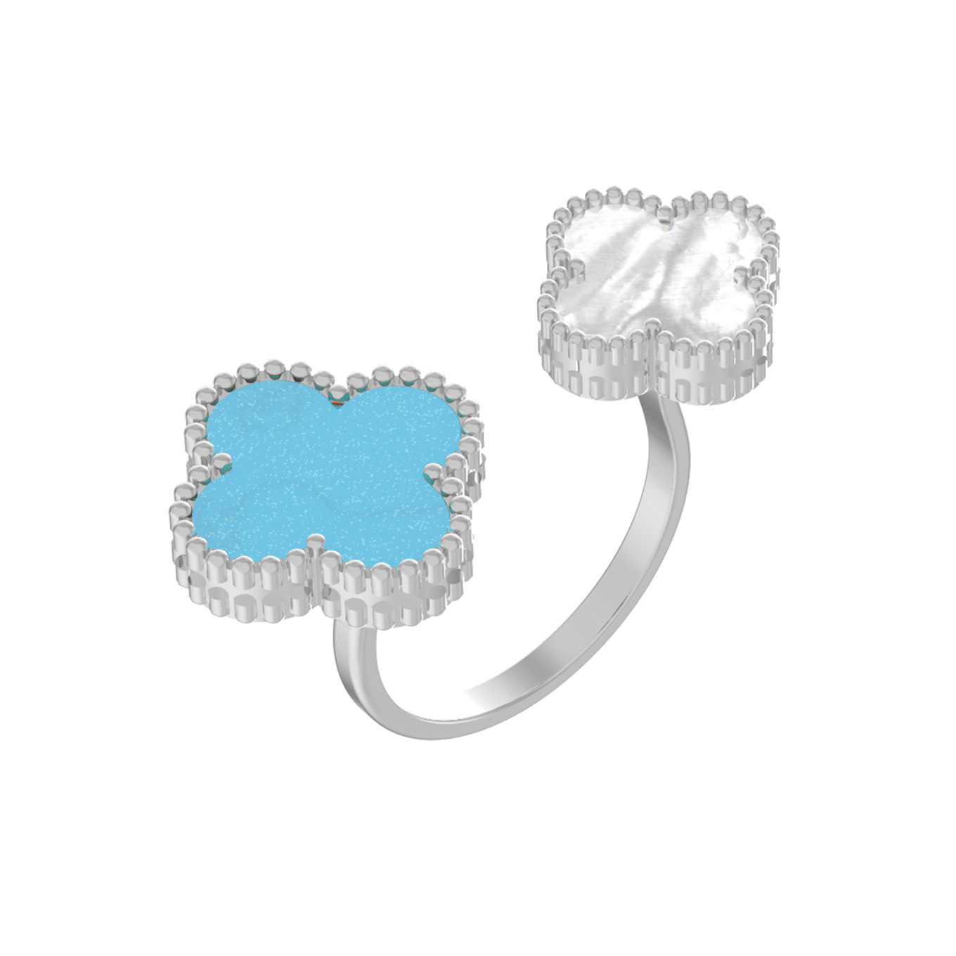 Элегантное кольцо из белого золота 585 пробы из коллекции De Luxe — Клевер станет безупречным акцентом в вашем образе. Дизайн изделия вдохновлен природной эстетикой и выполнен в форме нежного клевера, который придает украшению особую утонченность и символичность. Холодный блеск белого металла гармонично сочетается с контрастными вставками: ярко-бирюзовой бирюзой и нежным перламутром. Это сочетание придает украшению свежий и благородный вид, делая его универсальным аксессуаром.