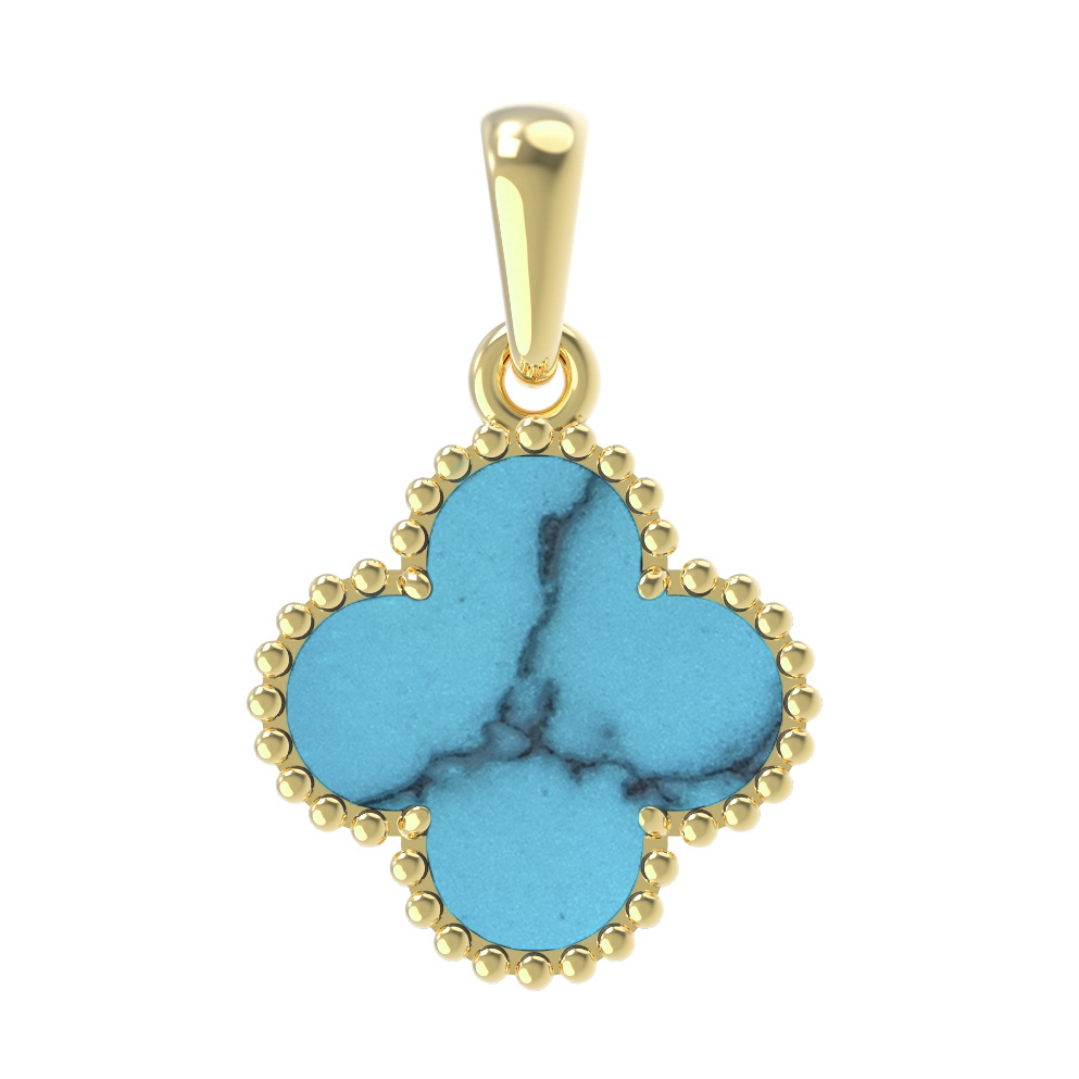 Элегантная подвеска из лимонного золота 585 пробы — это воплощение утонченности и стиля. Дизайн в форме клевера придает украшению особую символичность, делая его не просто аксессуаром, а значимым элементом вашего образа. Лимонный оттенок драгоценного металла гармонично сочетается с насыщенной бирюзой, которая является главной вставкой изделия. Яркий бирюзовый цвет камня эффектно выделяется на фоне золотого блеска, привлекая внимание к каждой детали.