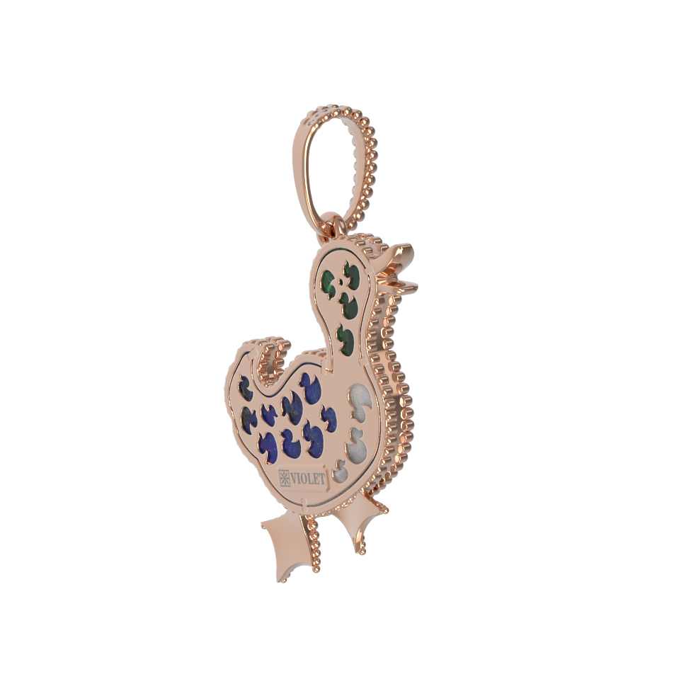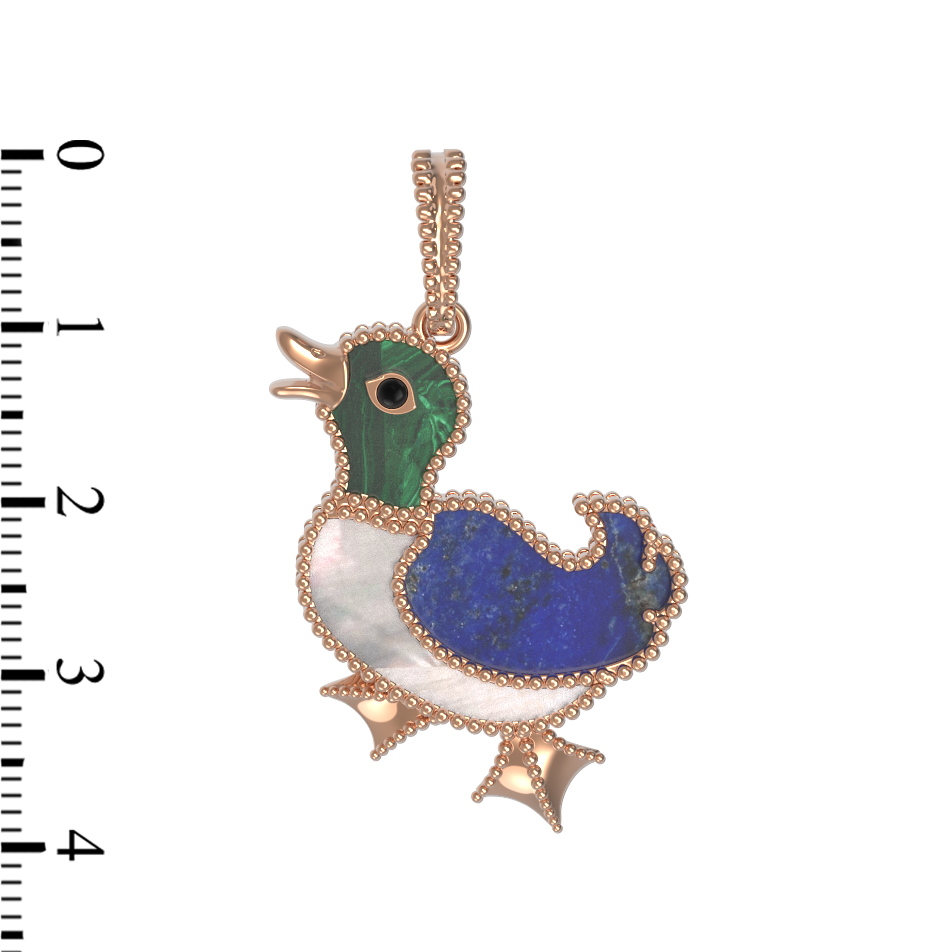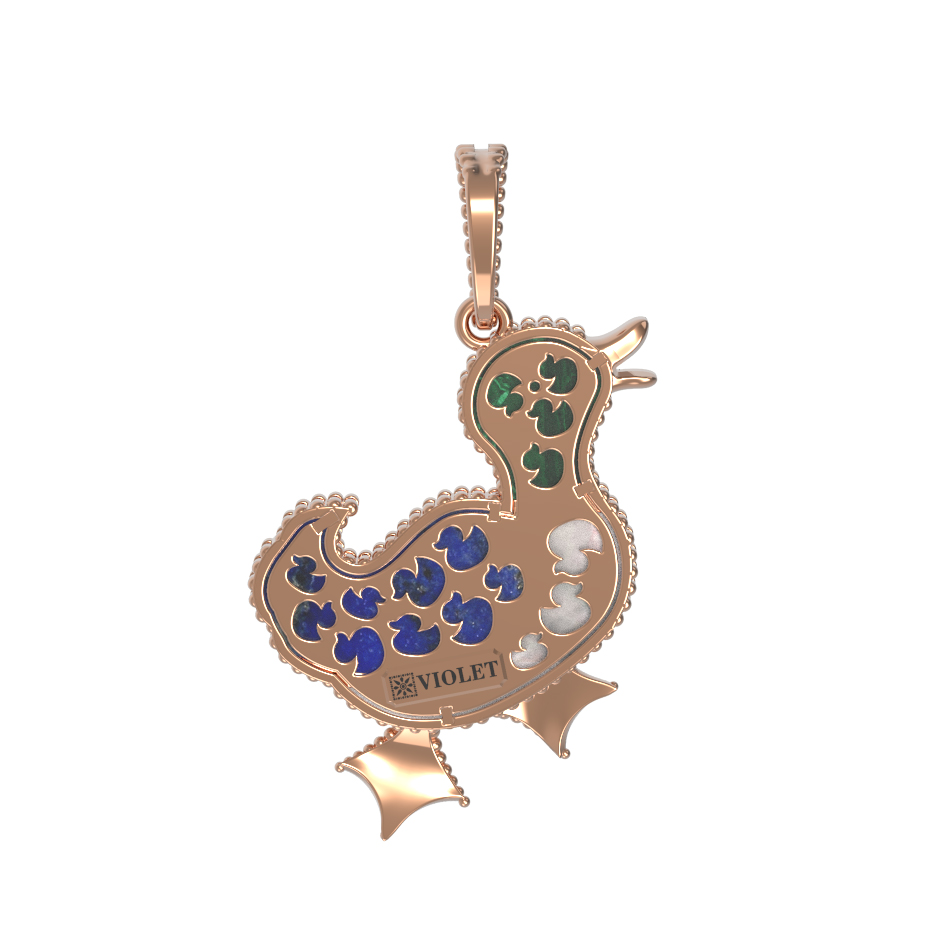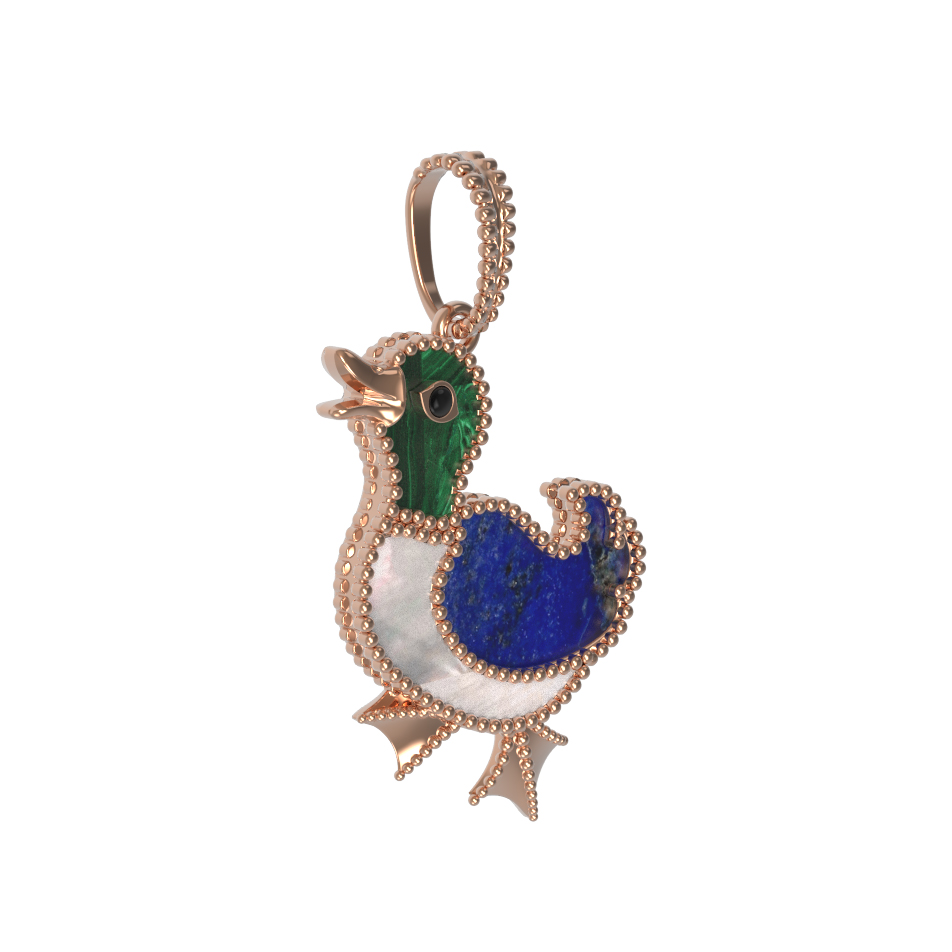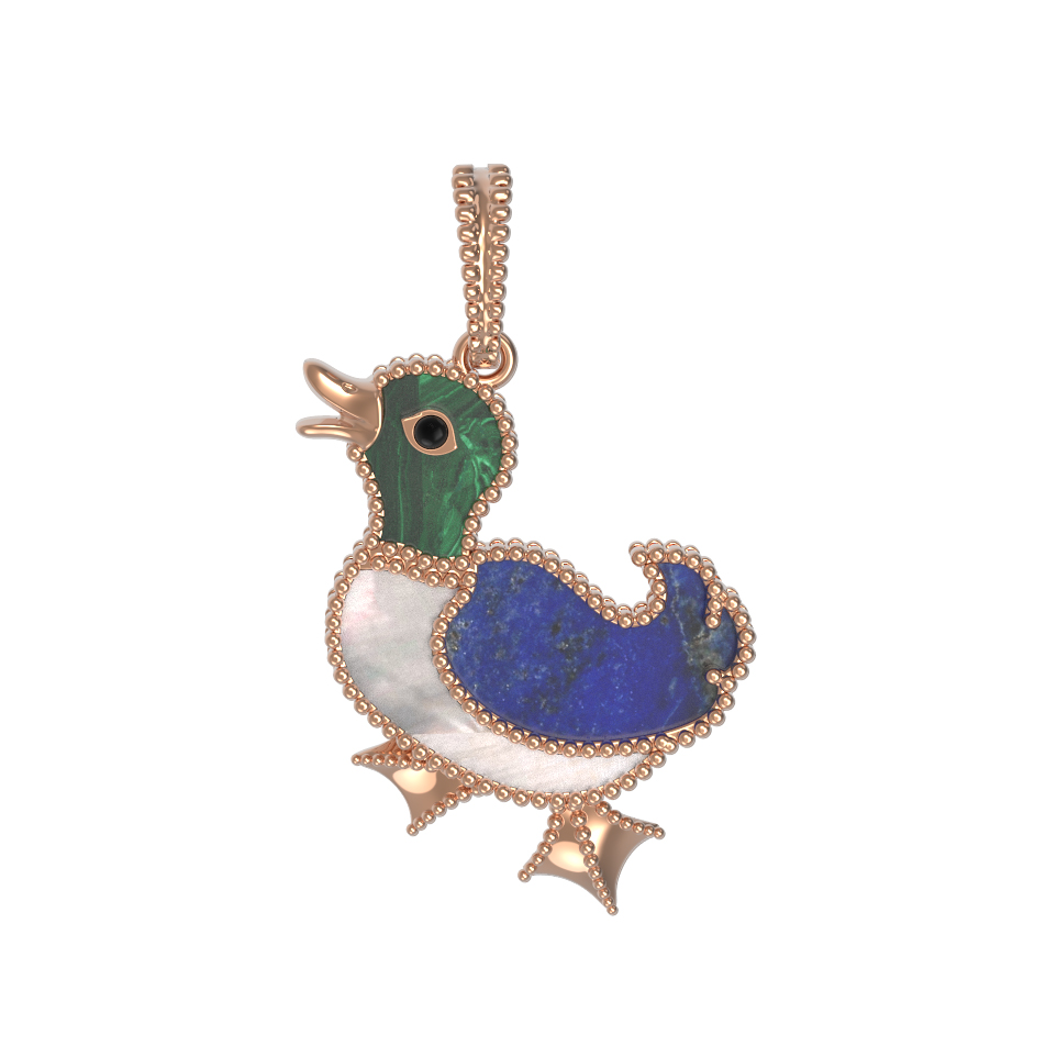 В центре композиции гармонично сочетаются природные камни и ювелирная техника. Голову птицы украшает насыщенный зеленый малахит, контрастирующий с нежным сиянием перламутра на грудке и глубоким синим цветом лазурита на крыльях. Эмаль и разноцветные вставки придают подвеске особенную выразительность, создавая игру света и цвета при каждом движении. В изделии использовано 2 основные вставки, которые идеально дополняют теплое сияние красного золота.