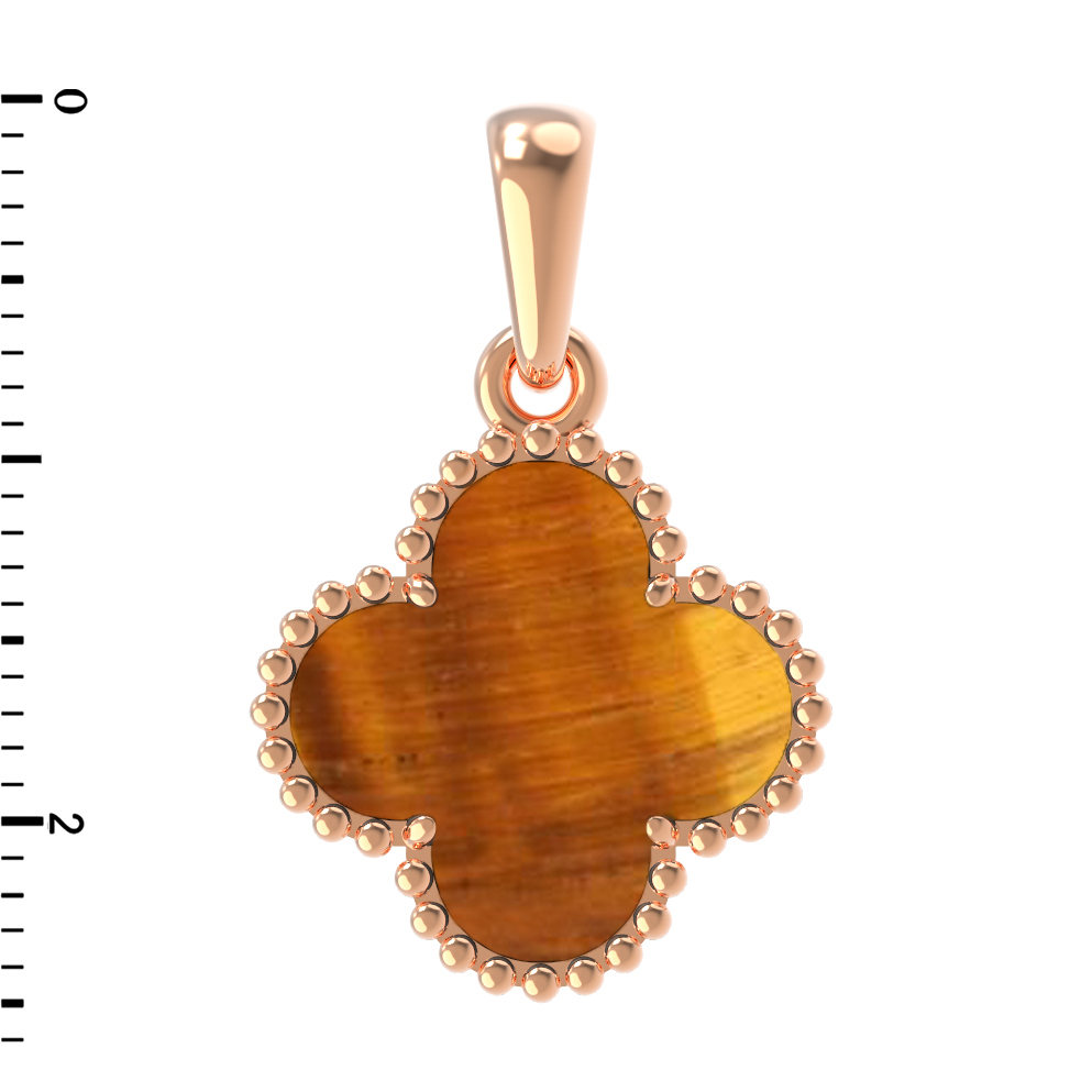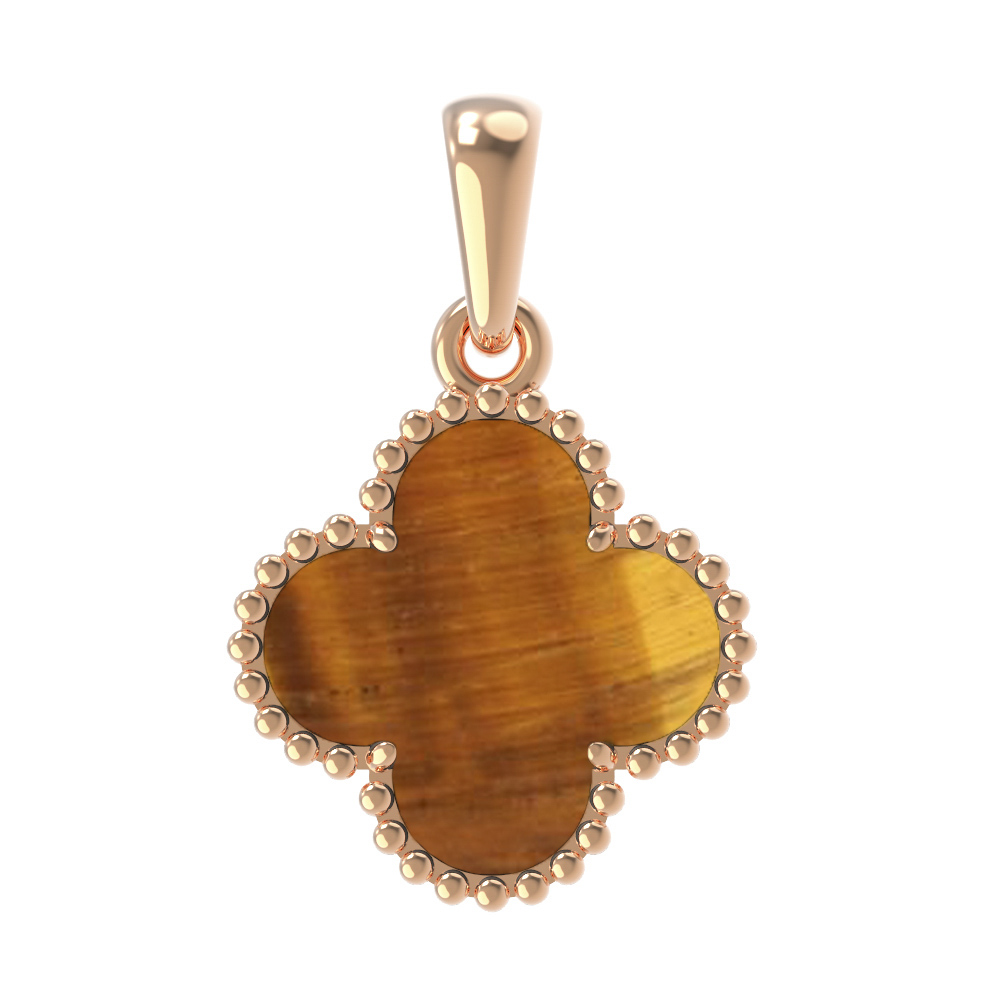 Изысканная подвеска из красного золота 585 пробы — это воплощение утонченного стиля и природной красоты. Центральным элементом украшения выступает вставка из тигрового глаза, обладающая глубоким и насыщенным оранжевым цветом. Дизайн изделия, выполненный в форме классического клевера, подчеркнут филигранной отделкой по контуру, что придает ювелирному украшению особенную выразительность и визуальный объем.