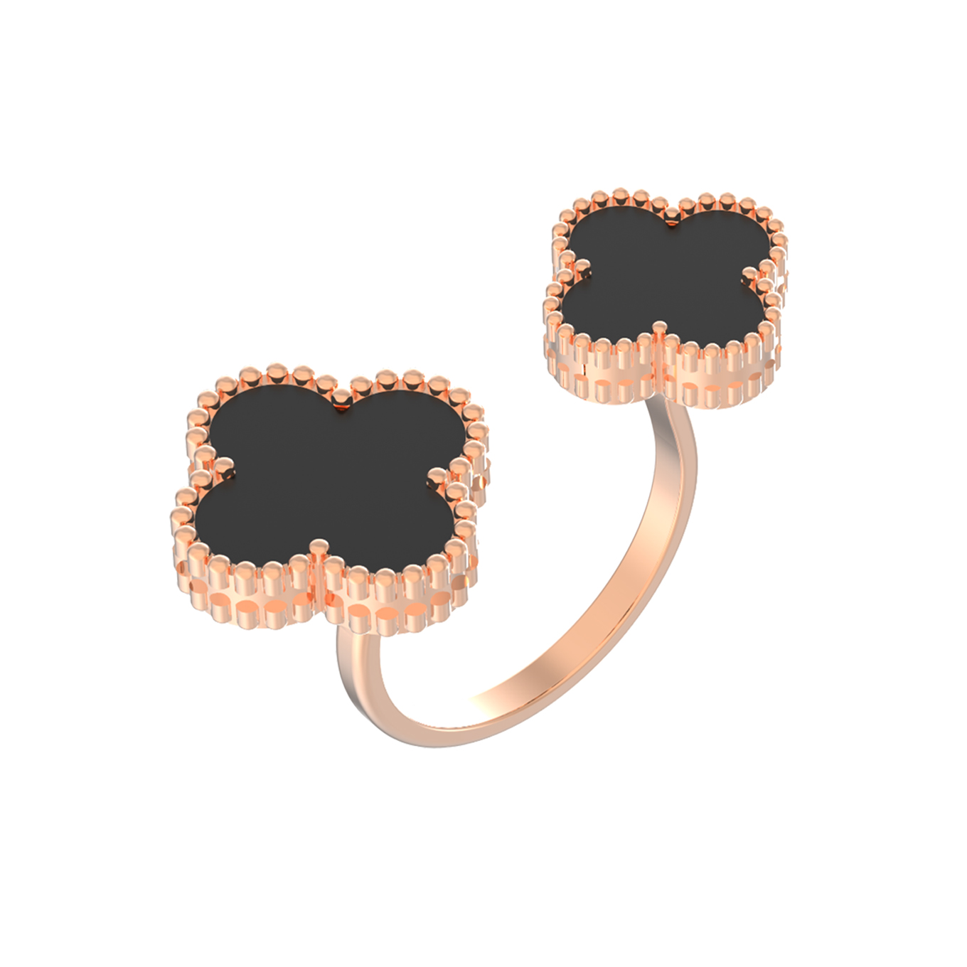 Элегантное кольцо из красного золота 585 пробы станет утонченным акцентом в вашем образе. Дизайн украшения, выполненный в стиле клевер из коллекции De Luxe — Клевер, отличается выразительностью и гармонией линий. Центральным элементом композиции выступают две вставки из благородного оникса насыщенного черного цвета, которые создают эффектный контраст с теплым оттенком драгоценного металла.