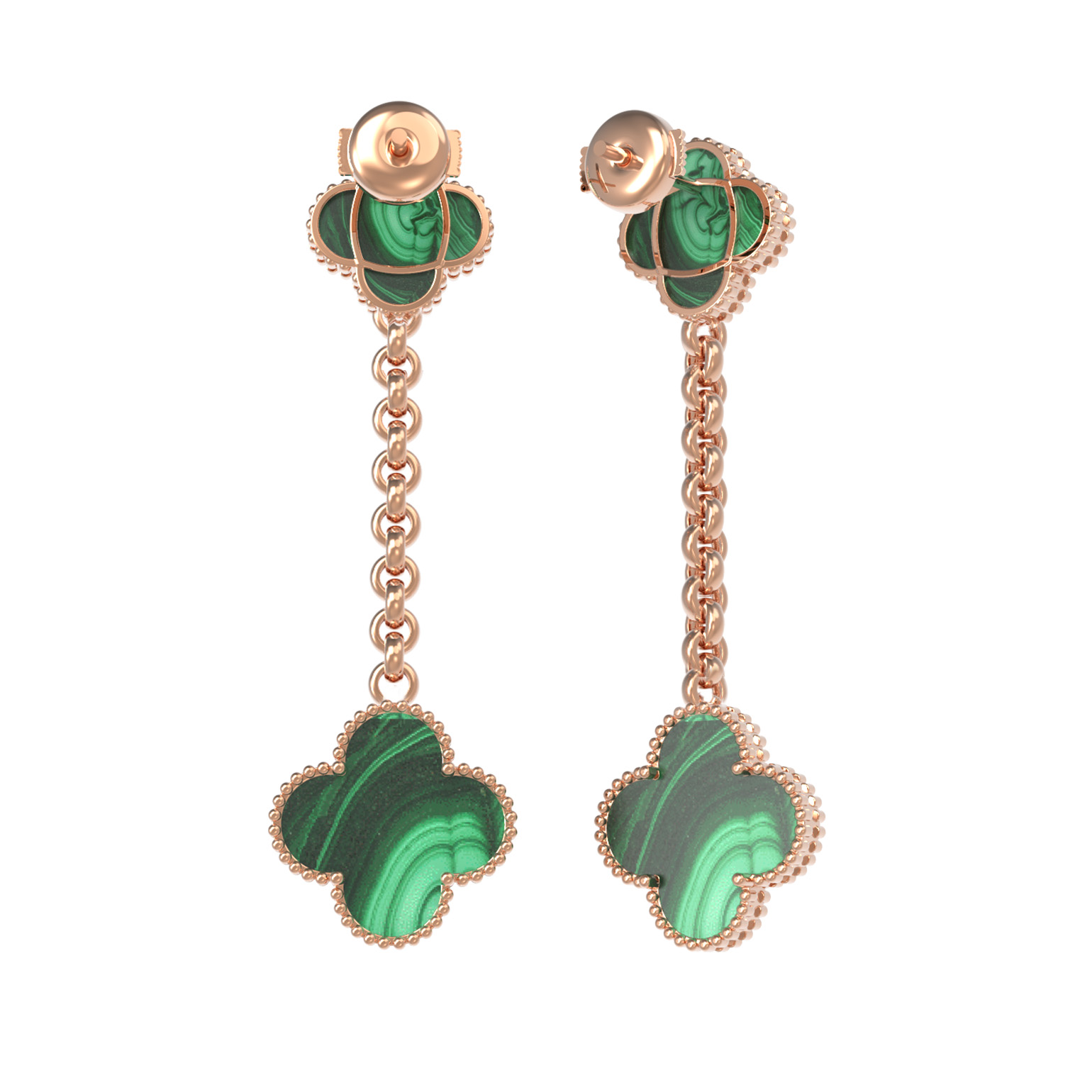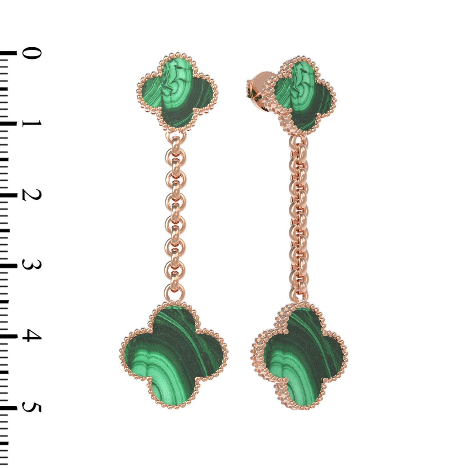 Элегантные серьги из красного золота 585 пробы — воплощение утонченного стиля и природной красоты. Изделие из коллекции De Luxe — Клевер притягивает взгляд своим изысканным дизайном в форме клевера, который символизирует удачу и благополучие. Глубокий, насыщенный зелёный цвет малахита великолепно контрастирует с теплым блеском красного золота, создавая гармоничный и выразительный образ.
